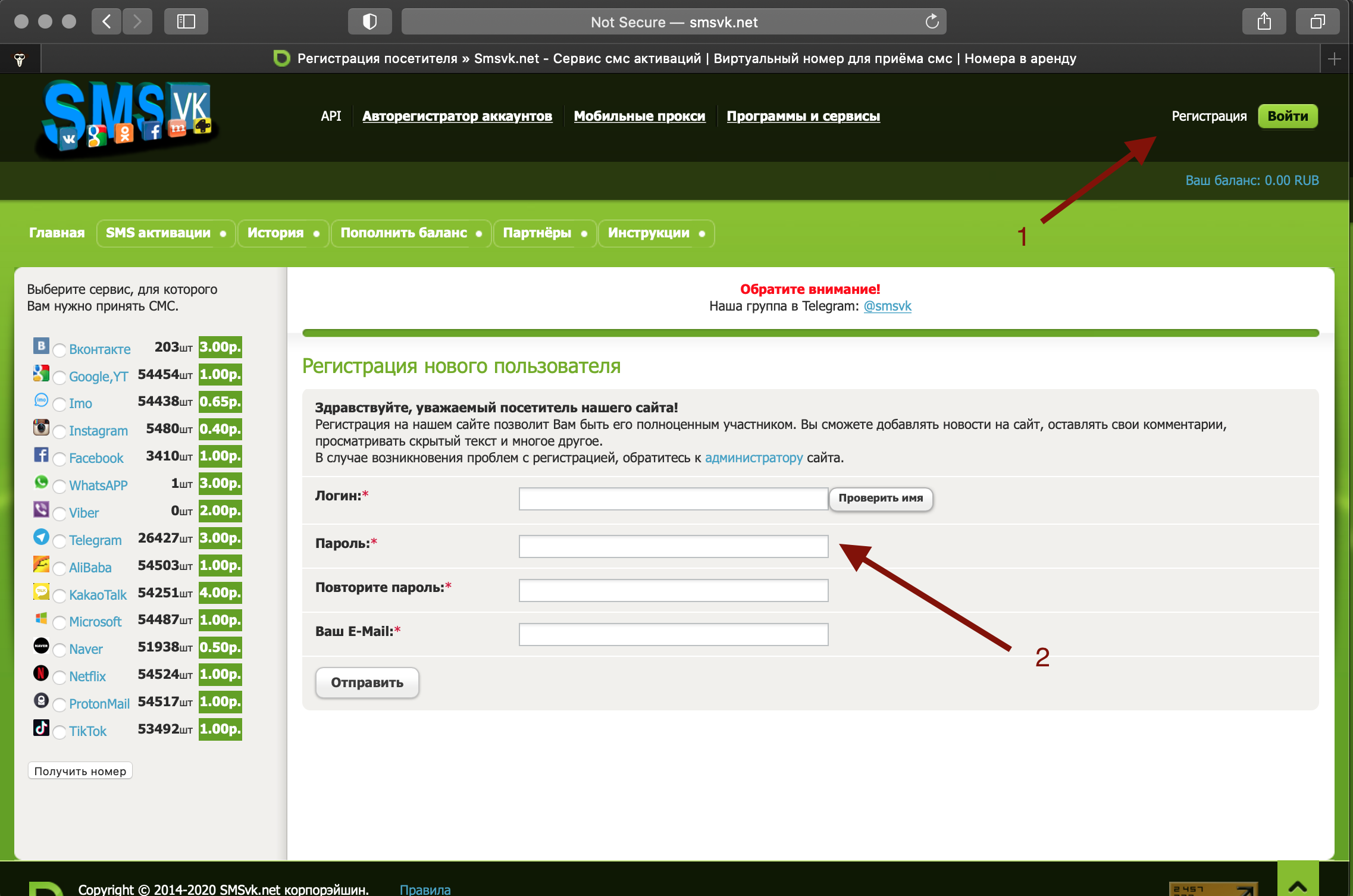 - Нажмите на кнопку регистрация (стрелка 1)