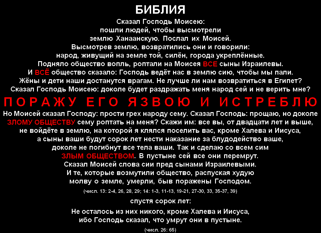 Затем повторяется сцена из истории про золотого тельца, так как обезумевший из-за возникшей ситуации бог, обозвав иудеев "злым обществом", опять заявляет о своём желании всех их безжалостно поубивать, после чего слышит просьбу Моисея от такой крайности воздержаться, чуток успокаивается и заменяет им смертную казнь лишением свободы сроком на 40 лет с отбытием этого наказания в тяжелейших условиях пустыни. Причём возможность её покинуть по прошествии установленного им времени бесцельного нахождения в ней он оставляет только тем осужденным, у кого возраст не превышает двадцати лет, а также Халеву Иефонниину и Иисусу Навину. Всех остальных он обязывает умереть вследствие любой из многих "естественных" причин именно в пустыне раньше окончания установленного им срока, фактически превращая его для них в пожизненный. Своё решение он сообщает Моисею, а тот уже озвучивает его осужденным: "сыны ваши будут нести наказание за блудодейство ваше, доколе не погибнут тела ваши в пустыне". Несложно заметить, что поскольку за действия одних бог обрекает на длительное страдание ещё и других, ни в чём перед ним не провинившихся, в том числе, конечно же, детей, вынесенное им крайне жестокое решение также является и очень несправедливым. А так как жизнь совсем без насилия для него немыслима, он всех побывавших в Ханаане лазутчиков, кроме Иисуса и Халева, от необходимости страдать в пустыне освобождает, убивая их сразу. Разумеется, также на 40 лет он откладывает и операцию по его оккупации.