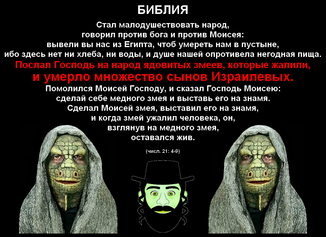 В двадцать первой главе бог видит, что его подопечные опять испытывают страдания, при чём не только от голода, но ещё и от жажды, а также слышит, как они говорят ему и Моисею: "вывели вы нас из Египта, чтоб умереть нам в пустыне, ибо здесь нет ни хлеба, ни воды, и душе нашей опротивела негодная пища". Однако в этот раз он отправляет к ним не мёртвых перепелов, а живых ядовитых "змеев". Описав промежуточный результат их нападения словами: "умерло множество сынов Израилевых", авторы затем сообщают, что в какой-то момент Моисей, желая гибель своих соплеменников прекратить, обращается за помощью к богу. Но тот вместо устранения проблемы приказывает страдающим из-за неё людям смастерить змея из меди и выставить его "на знамя". Выполняя его задание, умирать они не прекращают, а когда требующуюся фигуру всё-таки изготовляют, у них появляется удивительная возможность, будучи ужаленными, внимательно посмотреть на неё и, благодаря её магическим свойствам, выжить. При каких обстоятельствах змеи отступают, и этот трэш завершается, информация в тексте отсутствует.