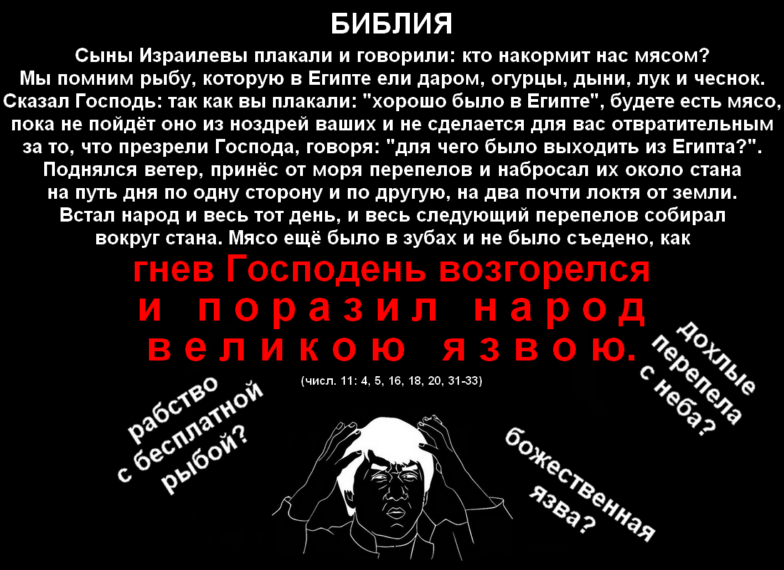 В той же главе рассказывается и о другом конфликте. Описывая его чуть подробнее, чем предыдущий, авторы попутно сообщают информацию об условиях жизни иудеев в том кошмарном "рабстве", которое в истории про "исход" из Египта использовалось богом в качестве повода, чтобы совершать массовые убийства. Так читатели узнают, что люди, "освобождённые" из него, вследствие чего вынужденные бродить по пустыне и голодать, в беседах между собой обсуждают его с неподдельной тоской: "мы помним рыбу, которую в Египте ели даром, огурцы, дыни, лук, чеснок, а ныне ничего нет". Бог их слова подслушивает, а затем передаёт им через Моисея свою угрозу: "так как вы плакали: "хорошо нам было в Египте", будете есть мясо не один день, не два, не десять, не двадцать, но целый месяц, пока не пойдёт оно из ноздрей ваших и не сделается для вас отвратительным за то, что презрели Господа". А доставляет он им его ветром со стороны моря в виде мёртвых перепелов. Прилетев, они валятся вниз и покрывают слоем толщиной почти в 2 локтя всю поверхность земли, находящуюся "около стана на путь дня по одну сторону и по другую". Однако завершается этот фрагмент всё же не тем, что оголодавшие люди, радуясь, приступают к сбору перепелов и занимаются им дольше суток, а фразой гораздо более ожидаемой: "мясо ещё было в зубах их, как гнев Господень возгорелся и поразил народ великою язвою".