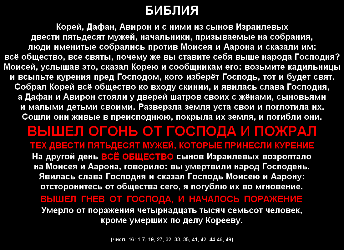 Однако уже на следующий день не 250 человек и не 1000, а "всё общество сынов Израилевых" предъявляет Моисею и его братцу, что они "умертвили народ Господень". Видя происходящее, бог свирепеет, опять говорит, что намерен абсолютно всех своих подопечных уничтожить, и даже уже начинает задуманное осуществлять. Но и Аарон не сидит на месте, а, быстро схватив кадильницу и засыпав в неё курения, запаливает их и мчится с нею в толпу погибающих людей. Своими действиями он каким-то чудесным образом охватившее бога безумие прекращает. Поэтому тот успевает погубить только "четырнадцать тысяч семьсот человек, кроме умерших по делу Корееву" именитых начальников общества и провалившихся в "преисподнюю" жён, сыновей и малых детей Дафана и Авирона.