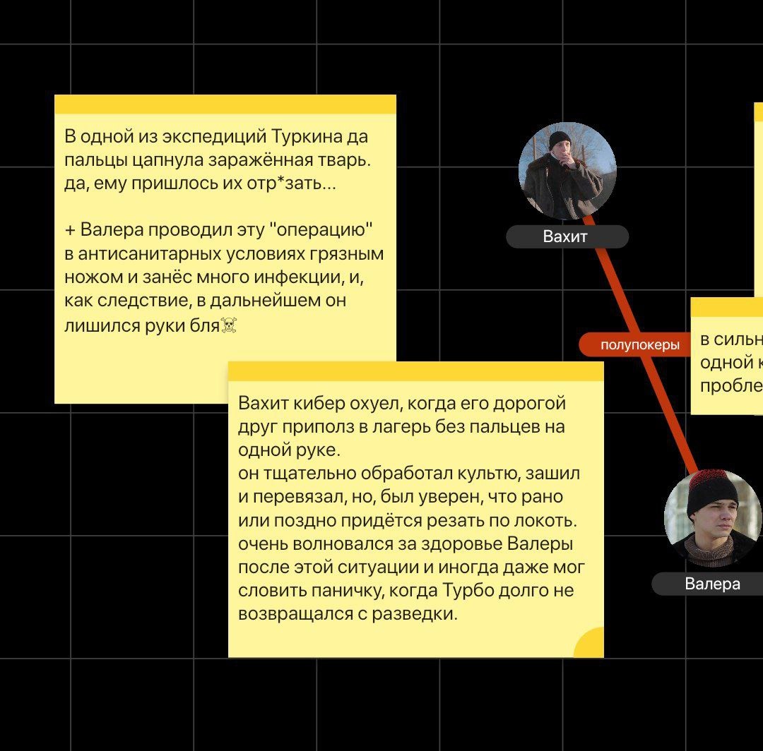 Андрей сообщает о ближайших экспедициях Валеры (он частенько выходил один), а Ирина разыгрывает сцену – она спасает Туркина от мутанта, которого сама же и приманила.