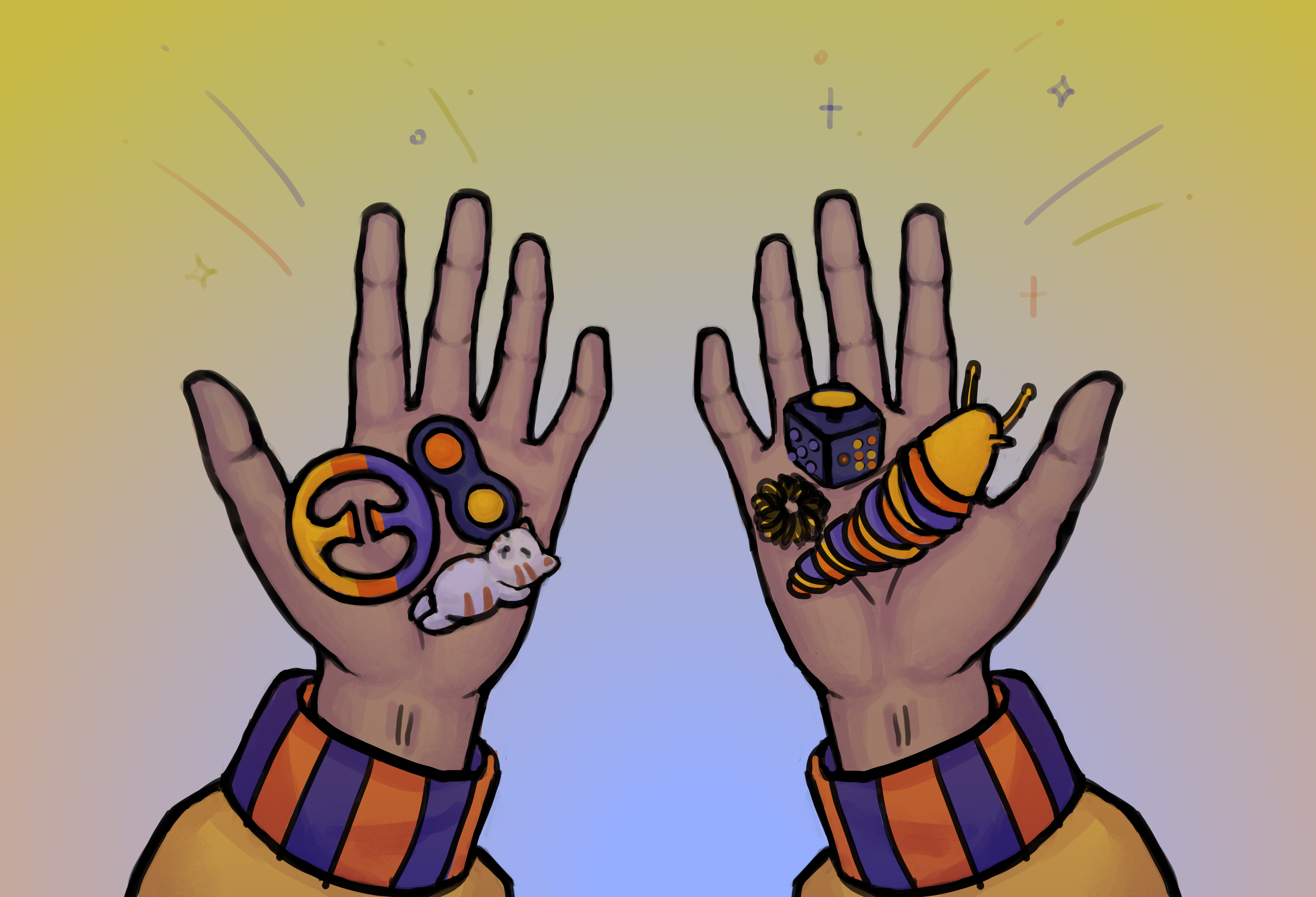 Стим игрушки – это предметы, созданные с целью стимминга. Стим игрушек существует огромное множество, и используют их не только дети, потому что стимминг в целом не является эксклюзивно-детским опытом. Популярными стим игрушками являются танглы, стим-браслеты, жевательные украшения и многие другие, большинство из них стоят недорого, их можно как заказать в интернете, так и найти в магазинах. Для стимминга также можно использовать предметы, изначально не являющиеся стим игрушками, если они помогают человеку в стимминге.
