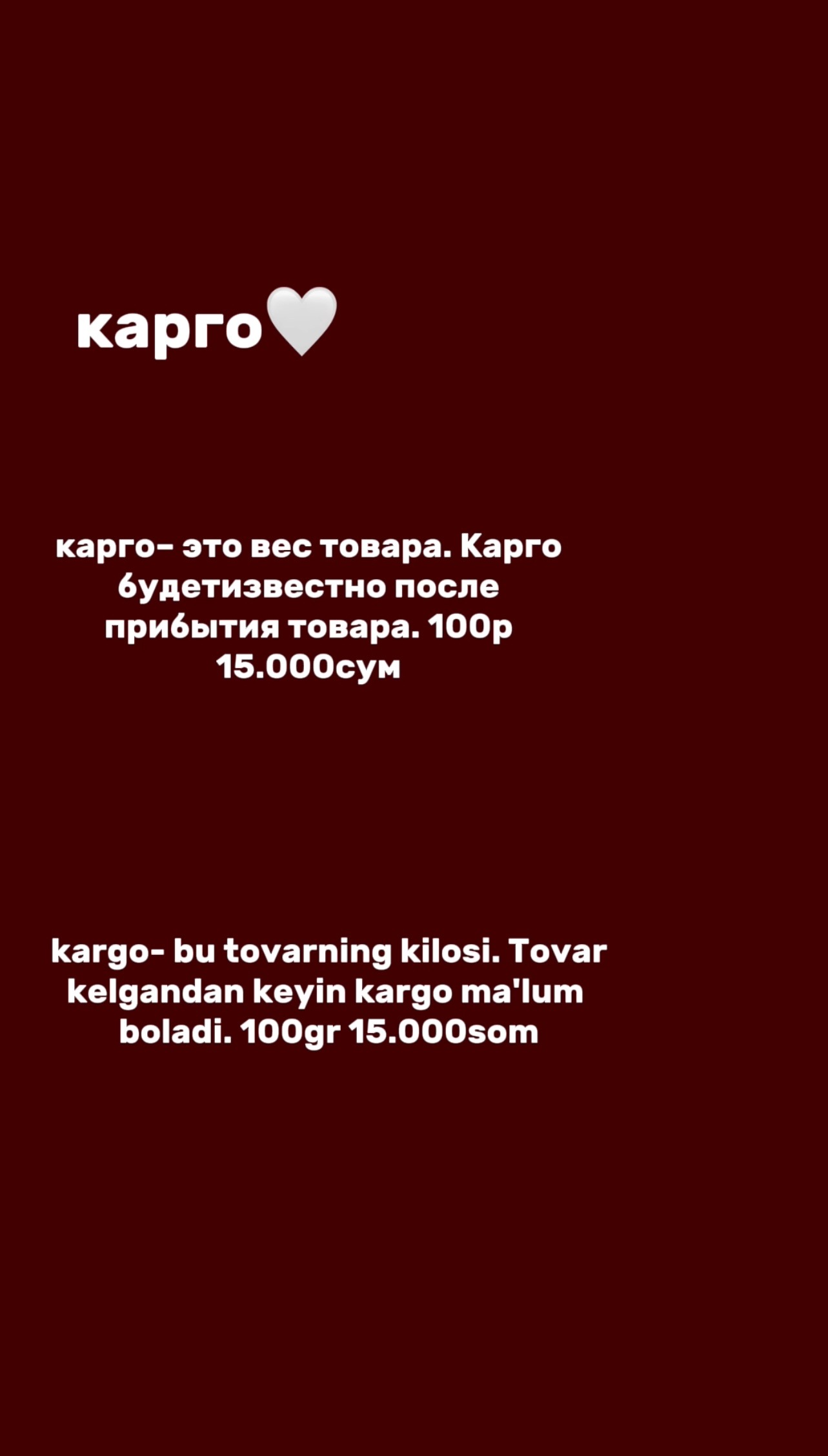 •после получения товара, нужно оплатить карго. Карго- это вес товара, за который нужно оплатить. 100гр 15.000 сум