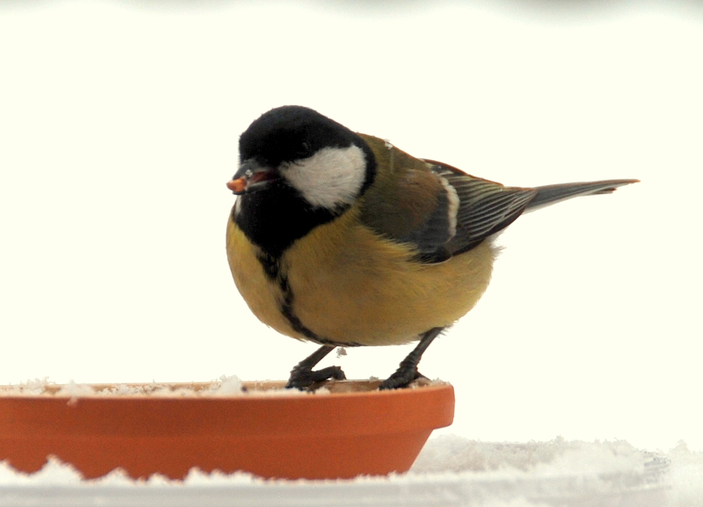 La cinciallegra ha una striscia nera che attraversa il petto e si collega con il nero sul capo . Il ventre è giallo . Si sposta sui rami bassi e a terra alla ricerca di bruchi, ragni, larve, semi e frutta .