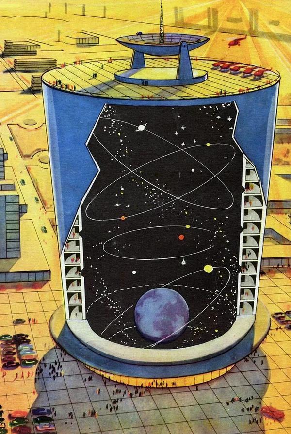 《天外世界》是黑曜石最新的代表作,这家传奇公司的前身黑岛,曾经创造了《辐射》。《辐射》的美学风格源自上世纪50年代的美国科幻宣传画,从下面这种图,能清楚地看到其设计源头。