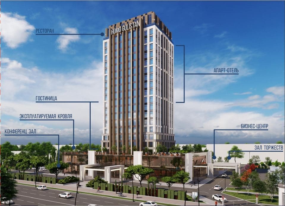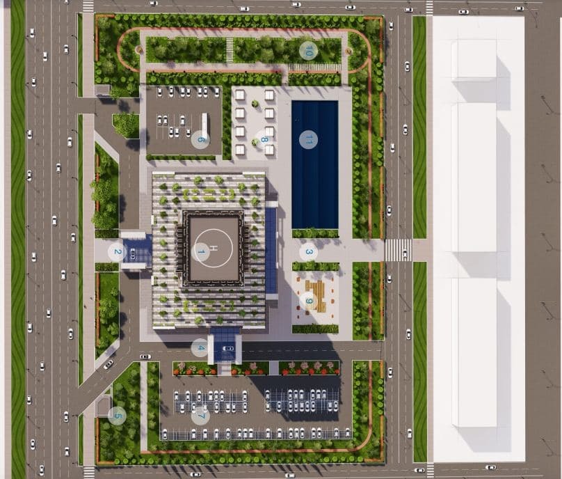 Бизнес марказнинг умумий майдони 70 гектар бўлиб, замонавий стандартларга жавоб берувчи қуйидаги ижтимоий соҳа обеъектларидан иборат бўлади.