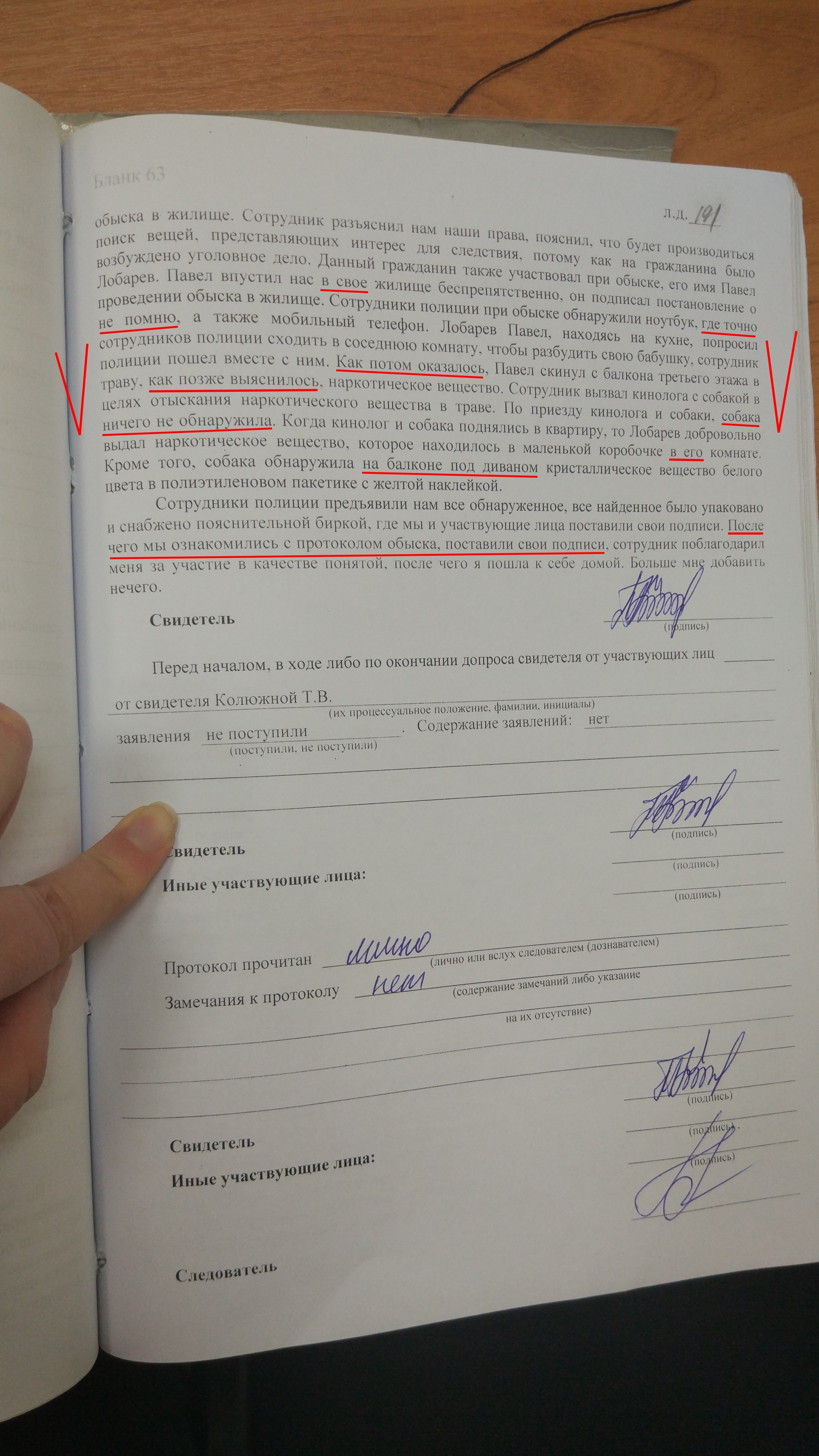 На мой взгляд, это - шедевр. Во-первых, понятая, походу не в курсе, что участвовала не в одном следственном действии (обыск), а в трёх (обыск и 2 осмотра), потому что слово "осмотр" она не упомянула ни разу. Во-вторых, понятая, побывав в квартире единственный раз в жизни, продемонстрировала свою уверенность в том, что ей известно, кому принадлежит квартира, где проводились следственные действия. "Павел пустил нас в своё жилище", - заявила понятая. Но помимо этого, в моём жилище, по убеждению понятой, имелась ещё и моя комната. "..которое находилось в маленькой коробочке в его комнате", - завила понятая. Но если, по убеждению понятой, всё жилище моё, то любая из частей целого - моя по определению. Однако "в его комнате" чудесно согласуется с аналогичной формулировкой следователя в протоколе осмотра. Там тоже сказано "у него в комнате". В-третьих, целью обыска было обнаружение меня и изъятие технических средств. Но понятая, приглашённая для участия в этом, просто не помнит, где был обнаружен ноутбук. А для чего она вообще там присутствовала тогда?? В-четвёртых, понятая утверждала, что вещество "собака обнаружила на балконе под диваном". А согласно протоколу следователя, вещество было "в дальнем левом углу, на полу, в коробке". Пятое. "Павел, находясь на кухне, попросил сотрудников полиции сходить в соседнюю комнату (в данном случае, не в свою, а в соседнюю)), чтобы разбудить свою бабушку, сотрудник полиции пошёл вместе с ним. Как потом оказалось, Павел скинул с балкона третьего этажа в траву, как позже выяснилось, наркотическое вещество... По приезду кинолога и собаки, собака ничего не обнаружила." То, что понятая бредит, это очевидно. Но Гришина то о чём думала, записывая такую бредятину в протокол допроса? И шестое. Последний параграф не соответствует другим материалам дела, согласно которым, обыск и ознакомление участников с его протоколом были завершены существенно раньше, в 8-23, а не "после чего".