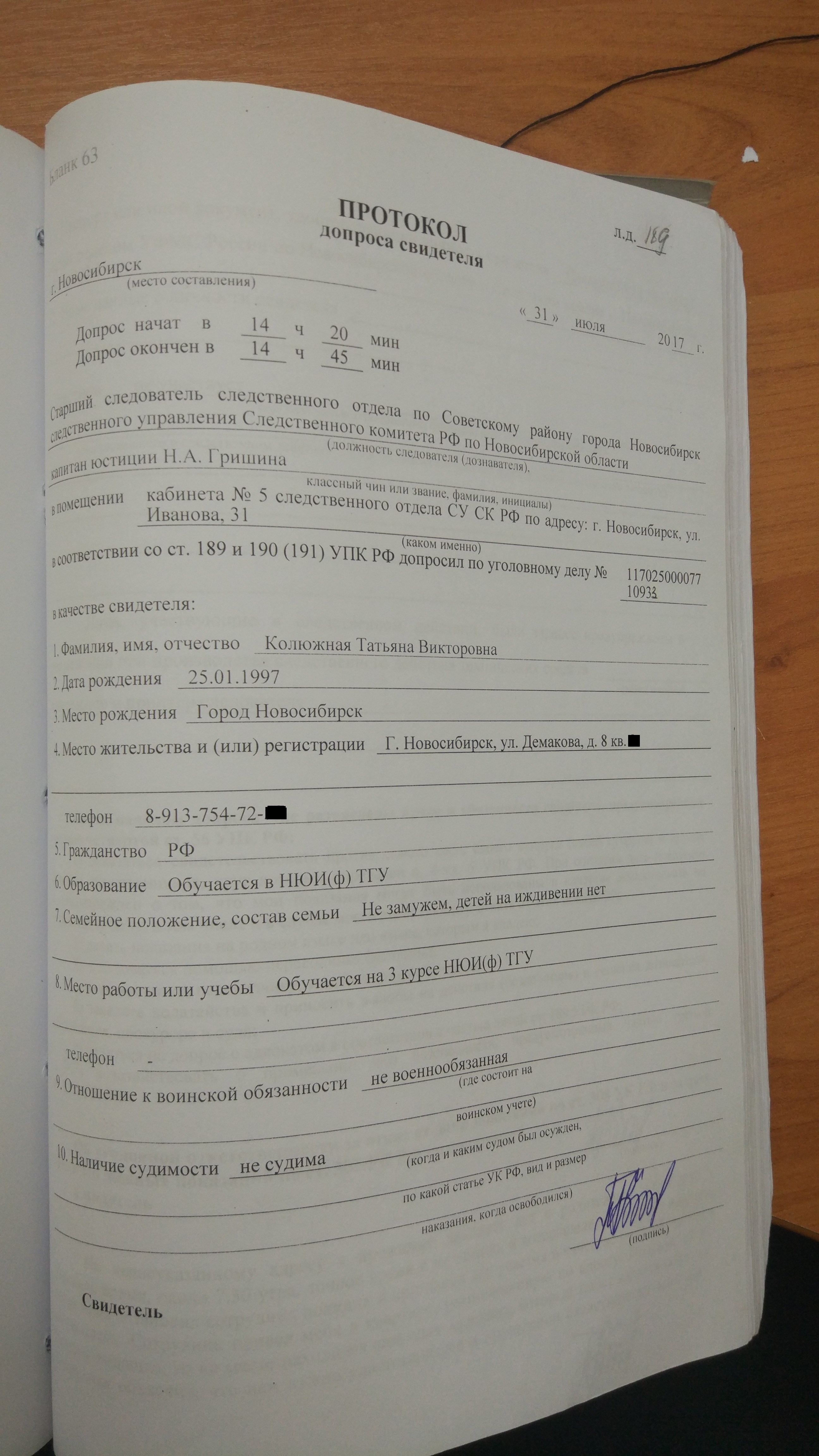 31.07.17 Гришина допросила понятую Колюжную Т.В., студентку-юристку, совершенно случайно оказавшуюся в восьмом часу утра возле адреса, где планировался обыск. Студентка с радостью согласилась потратить несколько часов своей жизни ранним летним утром, чтобы побыть понятой.