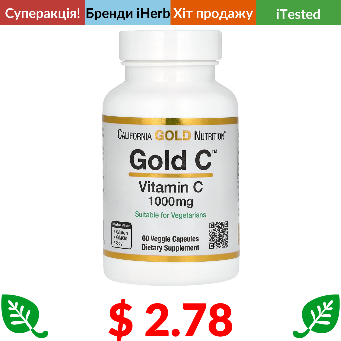 $ 2.78 California Gold Nutrition, Gold C, вітамін С, 1000 мг, 60 вегетаріанських капсул