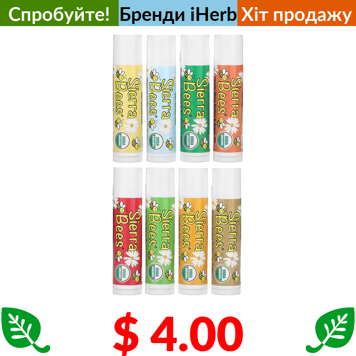 $ 4.00 Sierra Bees, набір органічних бальзамів для губ, 8 шт,. по 4,25 г (0,15 унції)