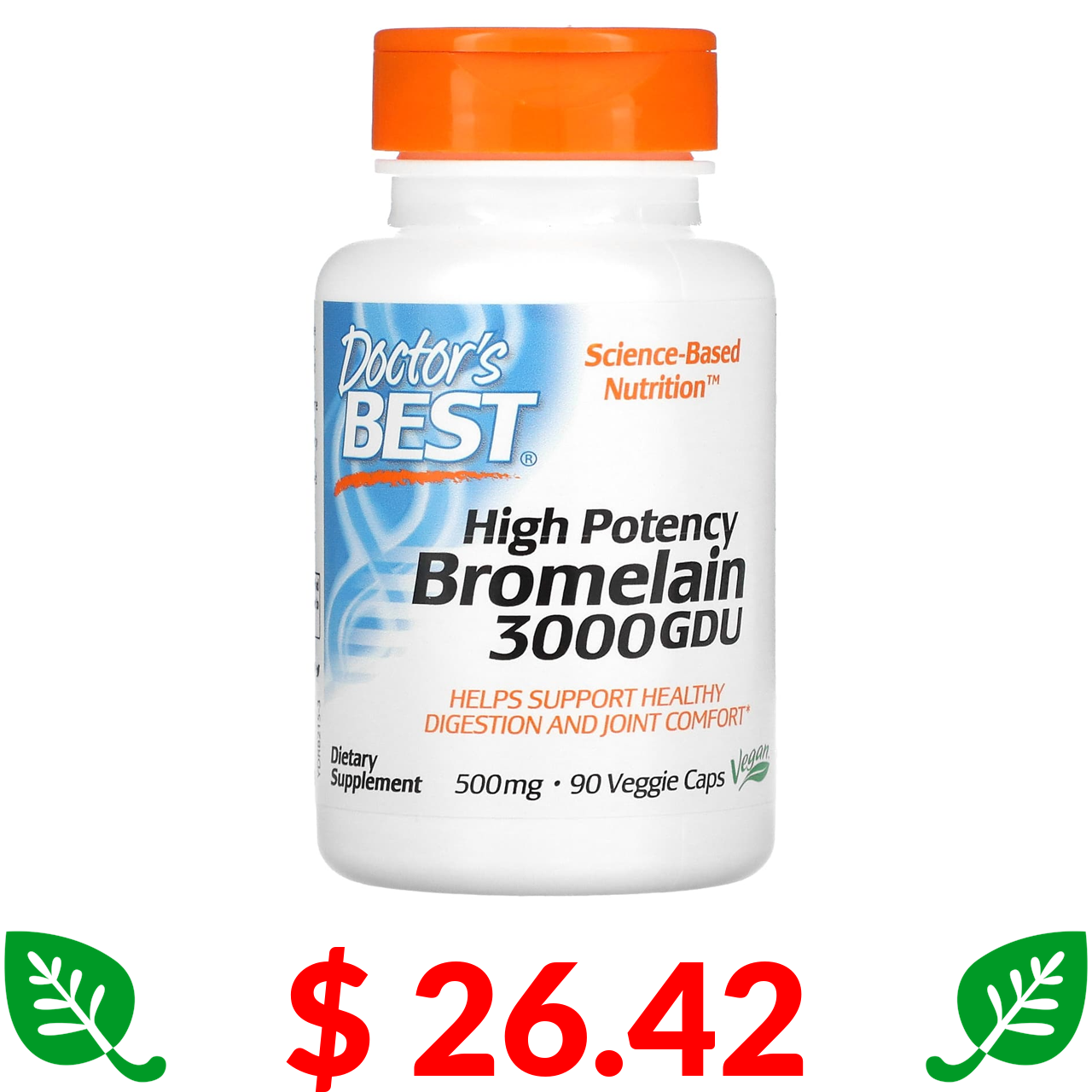 $ 26.42 Doctor's Best, високоефективний бромелаїн, 3000 GDU, 500 мг, 90 рослинних капсул