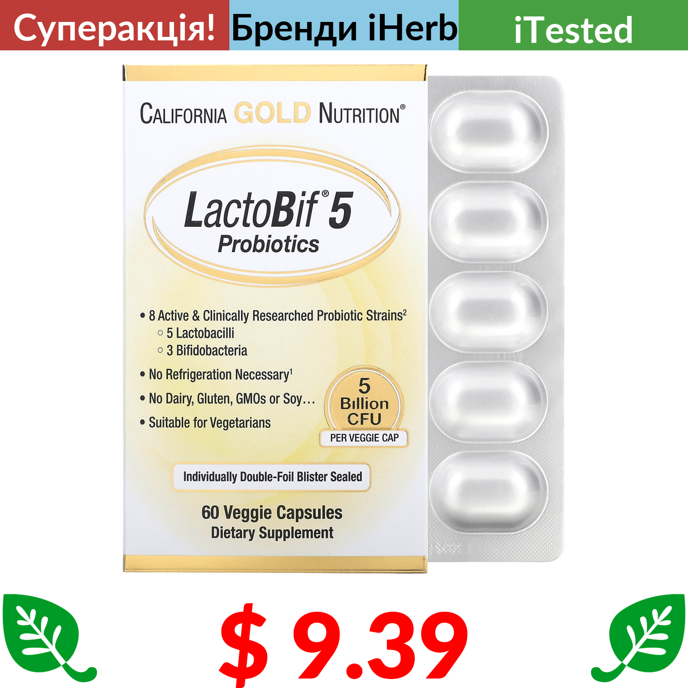 $ 9.39 California Gold Nutrition, LactoBif, пробіотики, 5 млрд КУО, 60 вегетаріанських капсул