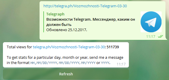 Для того, чтобы получить доступ к статистике Telegraph-статьи, отправьте боту ссылку на него. Так вы сможете увидеть количество просмотров, котораые набрала данная публикация вне зависимости от того, создавали ли ее вы или нет.