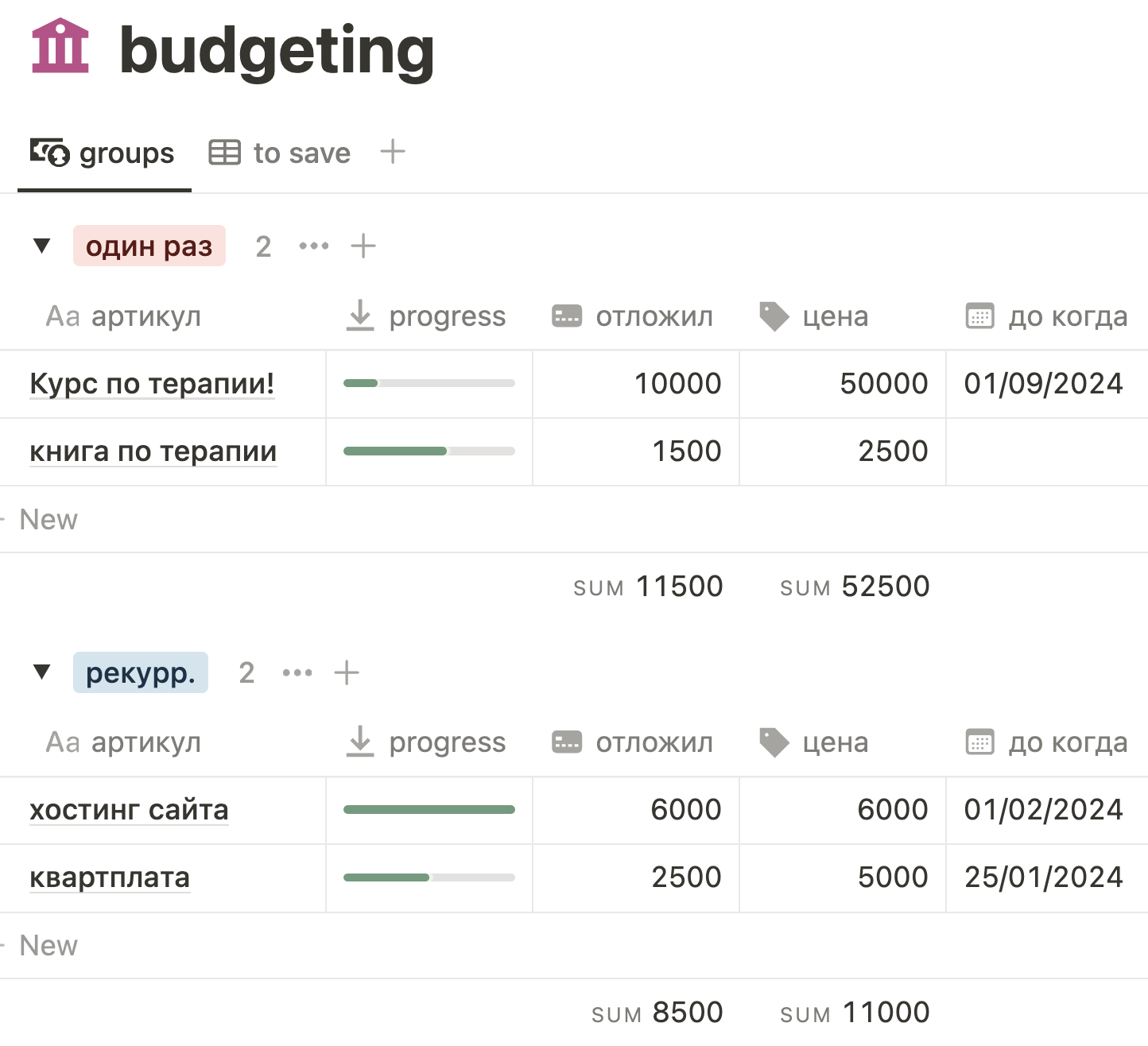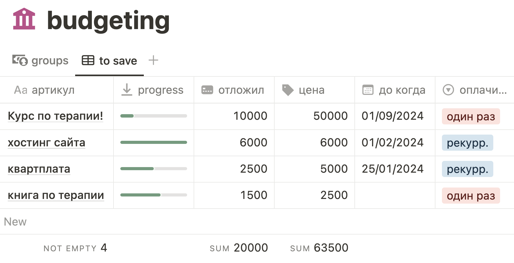 Наверху таблицы две вкладки – "groups" и "to save". Мы только что посмотрели на вид "to save" – там всё цели накоплений вместе. А ещё есть вид "groups" – там графы бюджета сгруппированы по тому, что мы оплатим один раз, и тому, что мы оплачиваем регулярно.