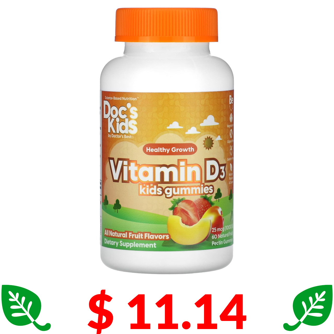 $ 11.14 Doctor's Best, Doc's Kids, жувальні таблетки з вітаміном D3 для дітей, повністю натуральні фрукти, 25 мкг (1000 МО), 60 жувальних таблеток із натуральним фруктовим пектином