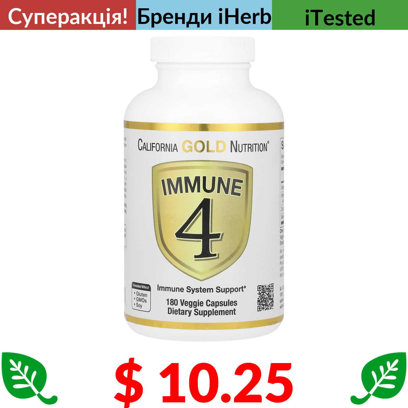 $ 10.25 California Gold Nutrition, Immune 4, засіб для зміцнення імунітету, 180 вегетаріанських капсул