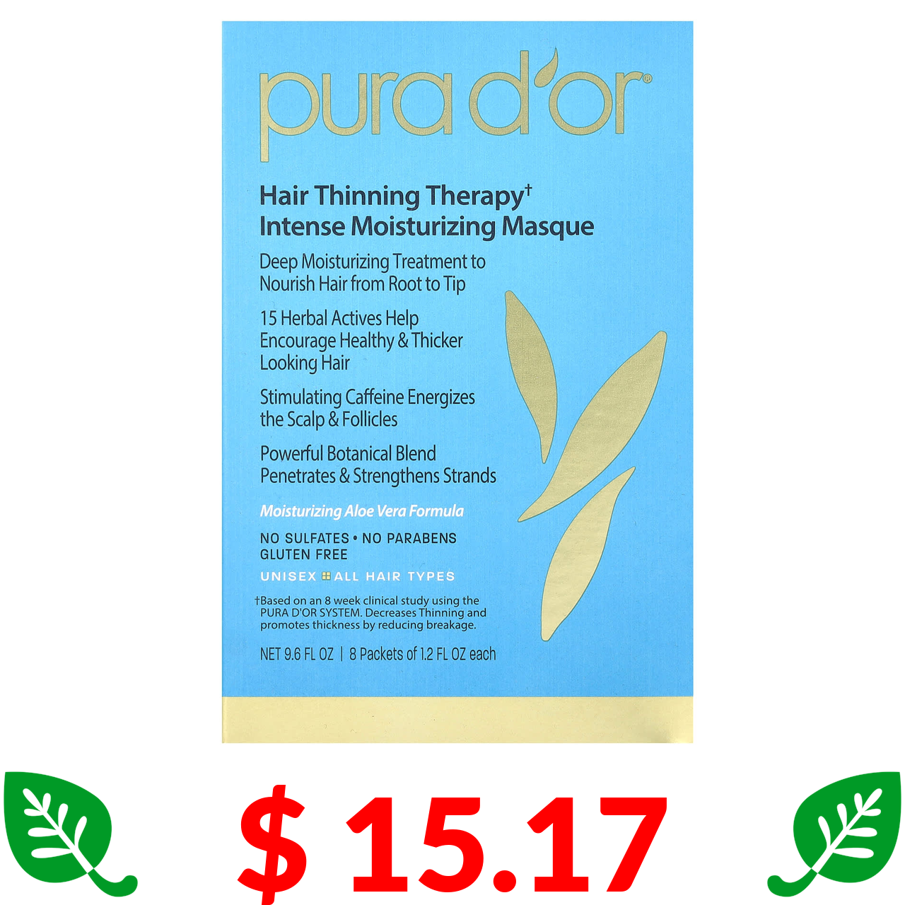 $ 15.17 Pura D'or, маска для інтенсивного зволоження проти випадіння волосся, 8 пакетиків по 36 мл (1,2 рідк. унції)