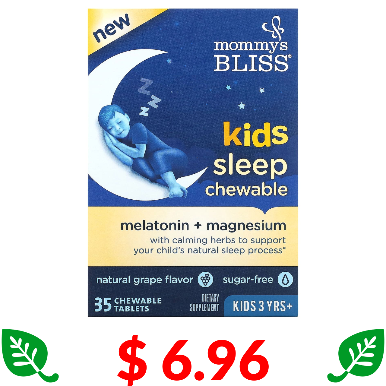 $ 6.96 Mommy's Bliss, Kids Sleep Chewable, мелатонін + магній для гарного сну, дітям від 3 років, натуральний виноград, 35 жувальних таблеток