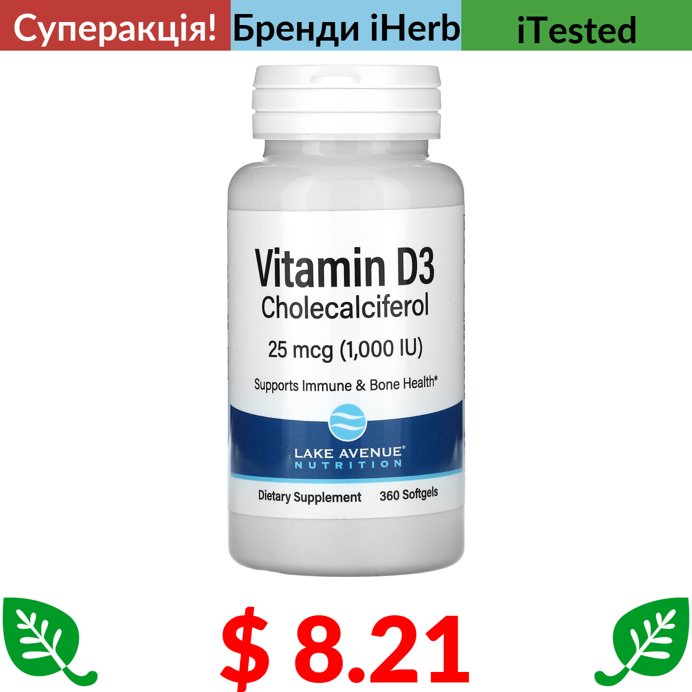 $ 8.21 Lake Avenue Nutrition, вітамін D3, 25 мкг (1000 МО), 360 капсул