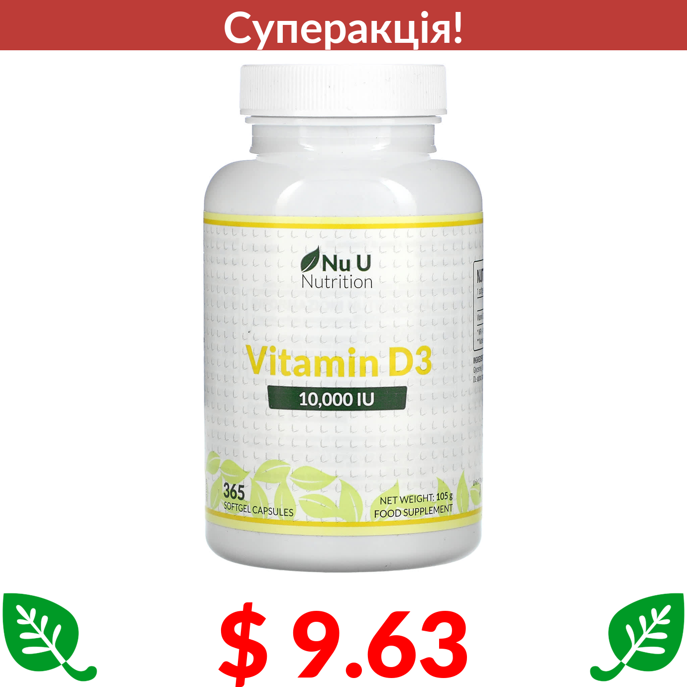 $ 9.63 Nu U Nutrition, Вітамін D3, 10 000 МО, 365 м’яких желатинових капсул