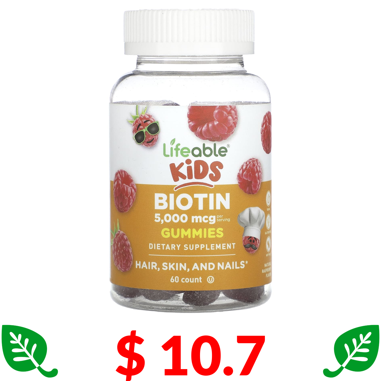 $ 10.7 Lifeable, біотин для дітей, з натуральним малиновим смаком, 5000 мкг, 60 жувальних мармеладок (2500 мкг в 1 шт.)