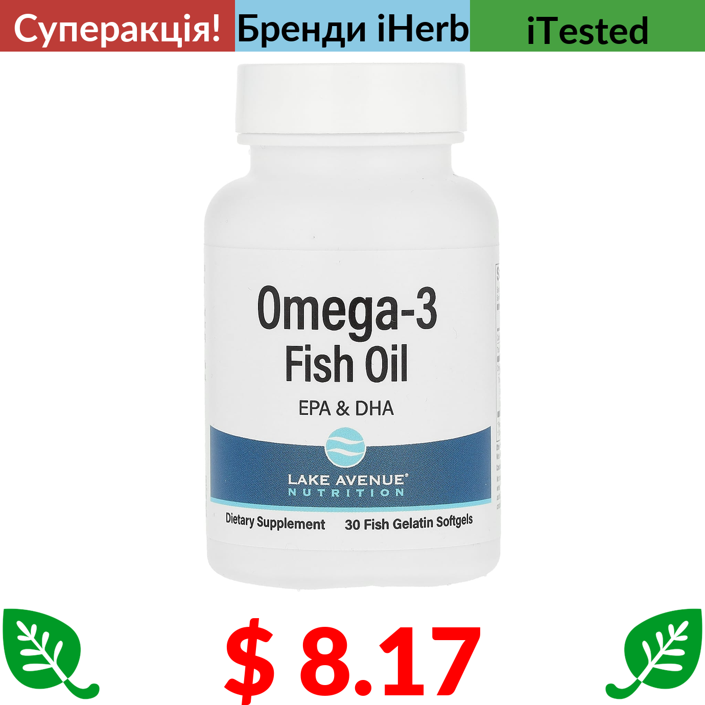 $ 8.17 Lake Avenue Nutrition, риб’ячий жир з омега-3, 1250 мг, 30 капсул із риб’ячого желатину