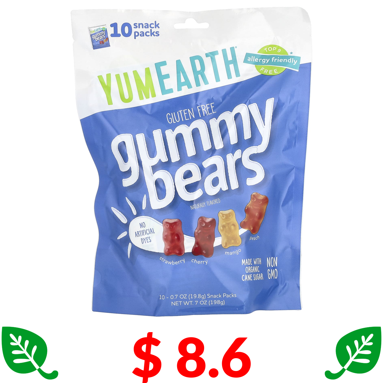 $ 8.6 YumEarth, безглютенові желейні ведмедики, полуниця, вишня, манго та персик, 10 пакетиків по 198 г (0,7 унції)