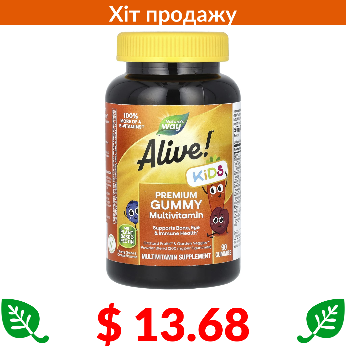 $ 13.68 Nature's Way, Alive! Kids, жувальні мультивітаміни преміальної якості для дітей, зі смаком вишні, винограду та апельсина, 90 жувальних мармеладок