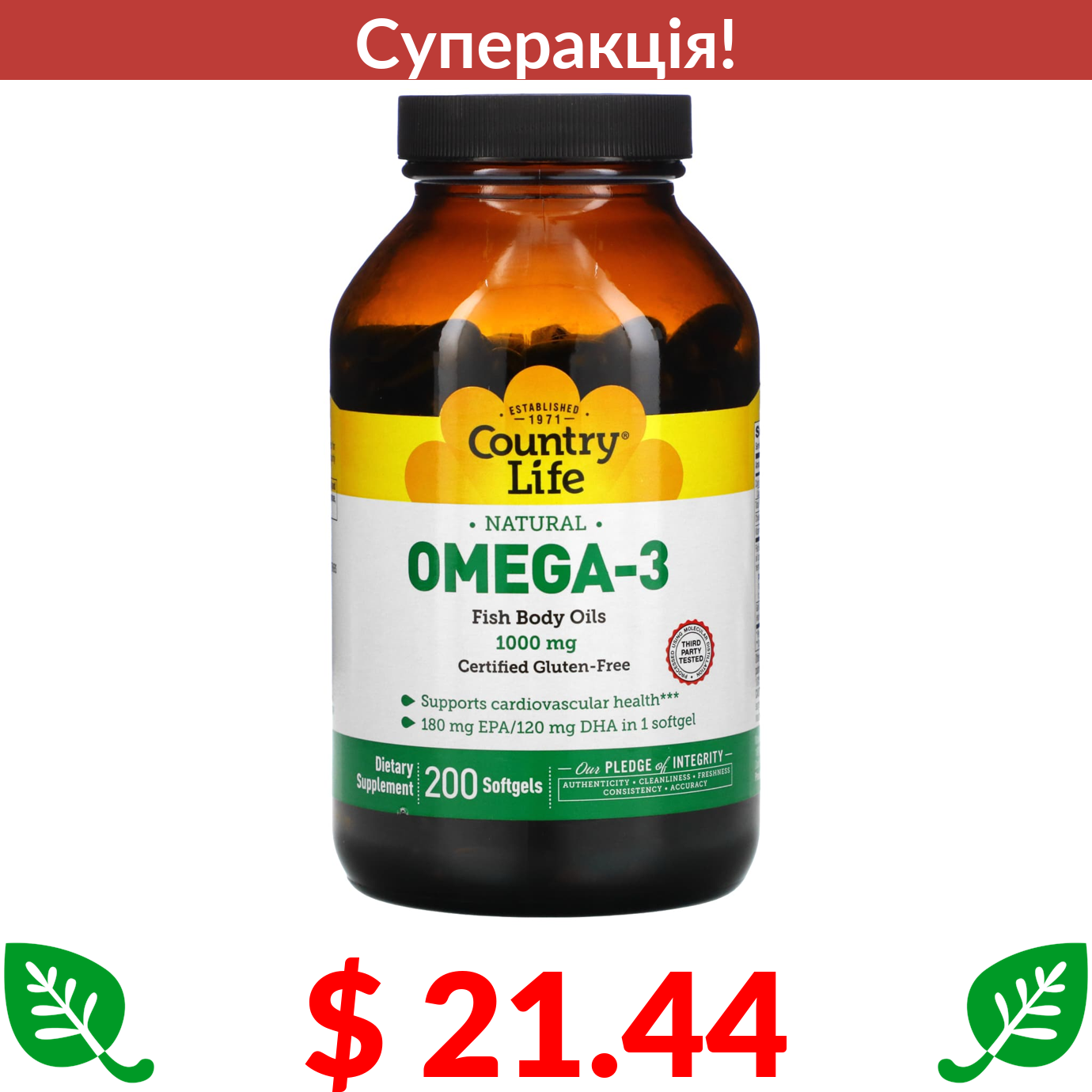 $ 21.44 Country Life, натуральна омега-3, 1000 мг, 200 капсул