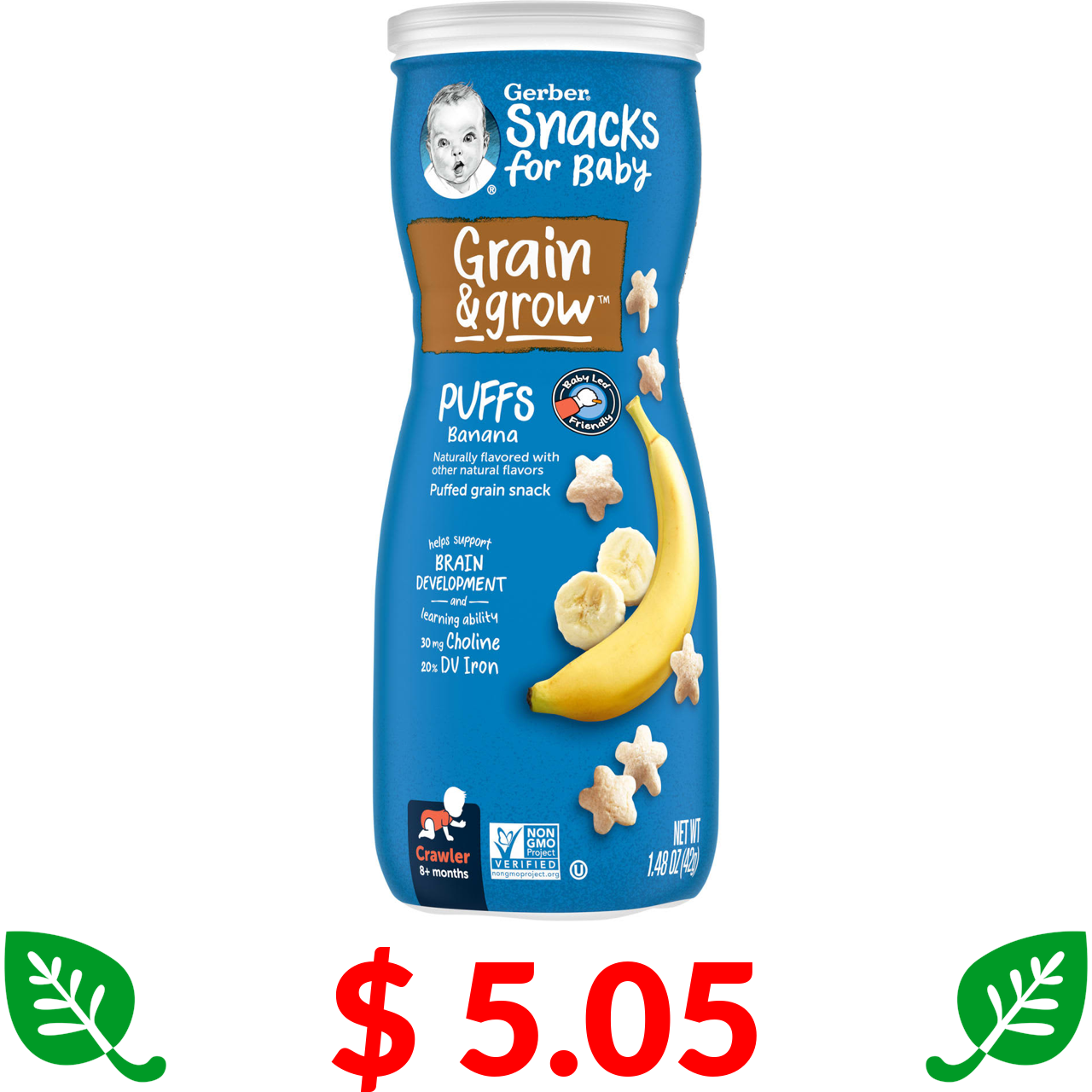 $ 5.05 Gerber, Puffs, зернові снеки, для дітей у віці від 8 місяців, банан, 42 г (1,48 унції)
