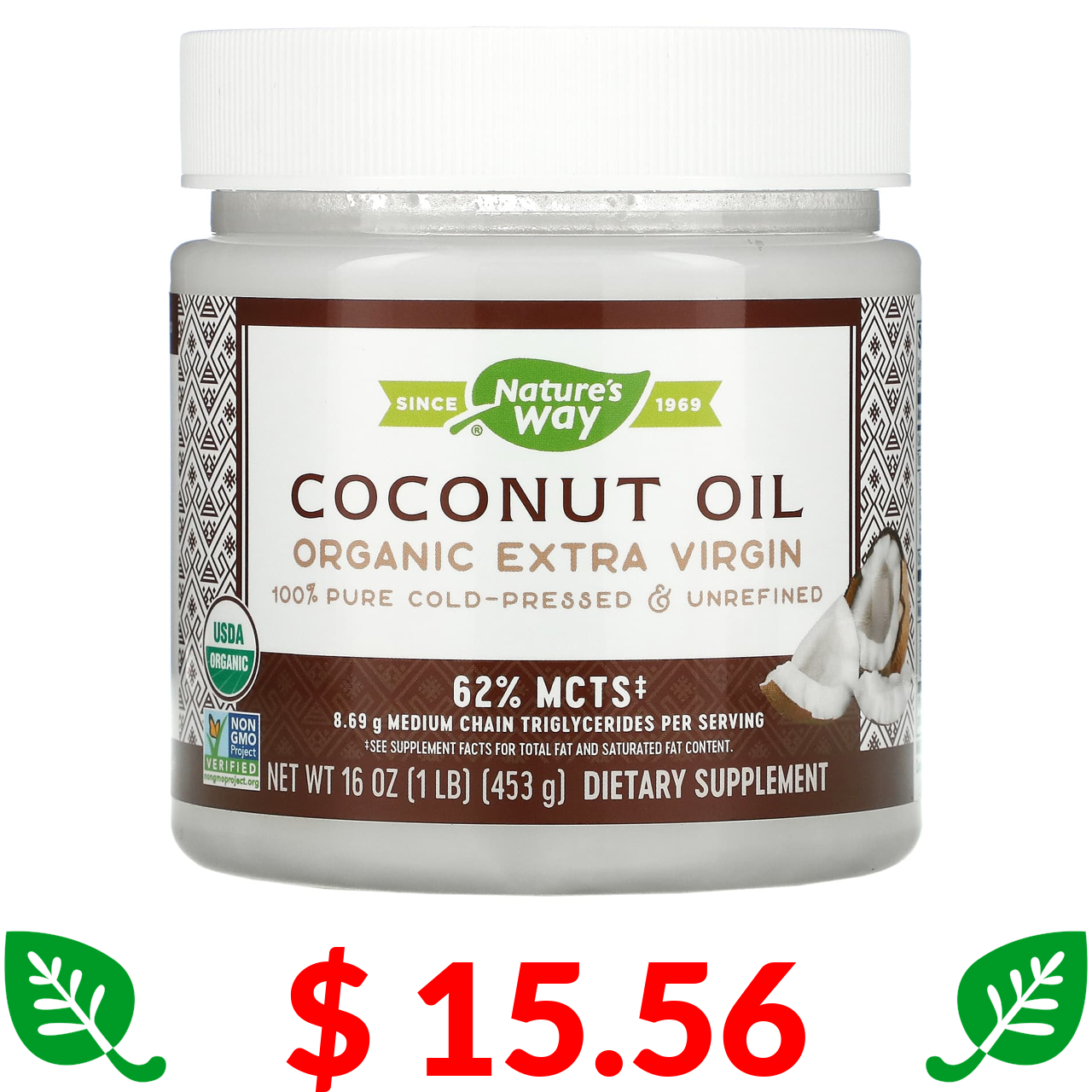$ 15.56 Nature's Way, органічна нерафінована кокосова олія першого віджиму, 453 г (16 унцій)
