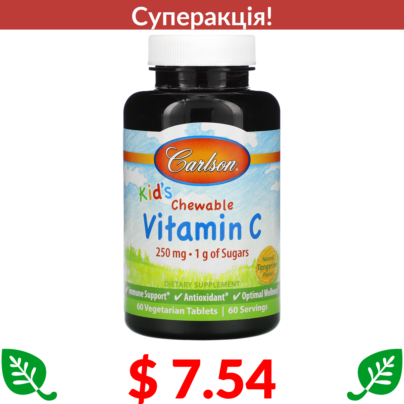 $ 7.54 Carlson, жувальний вітамін C, натуральний мандарин, 250 мг, 60 вегетаріанських таблеток