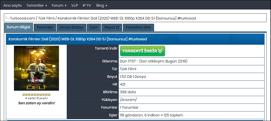 burada gördüğünüz gibi ayrıntılar verilmiş. aşağıya doğru giderseniz daha da ayrıntılı şeyleri görebilirsiniz. şimdi torrent'i indir diyelim: