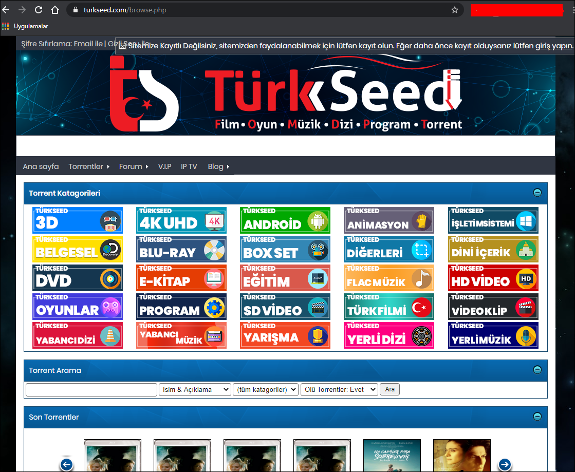 turkseed.com başlangıç için güzeldir. şimdi örnek bir torrent indirelim ve botla drive'a yükleyelim. siteye girdiğimizde torrentler > tüm torrentler'e tıkladım: