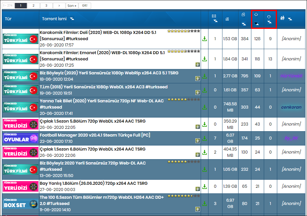 şu an torrent listemiz önümüzde ve en çok indirilenleri görmek istediğim için kırmızıyla çizdiğim yere tıklıyorum. aşağı işareti indirenleri (Leech / Download), yukarı işareti de gönderenleri (Seed / Upload) ifade ediyor. bunların çok olmasının neden önemli olduğuna değinmiştik.