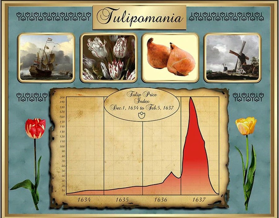 Когда на Ближнем Востоке вырастили первые тюльпаны, весь мир «сошёл с ума». В 1623 году одна луковица Semper Augustus с цветами из красных и белых лепестков стоила 1 тыс. флоринов (примерно ₽6,5 млн на текущие деньги), а в самый разгар лихорадки цены на этот сорт подскочили до 4,6 тыс. флоринов. Свинья в то время стоила 30 флоринов, а корова — 100 флоринов. Работающие голландцы в среднем получали 150 флоринов в год.