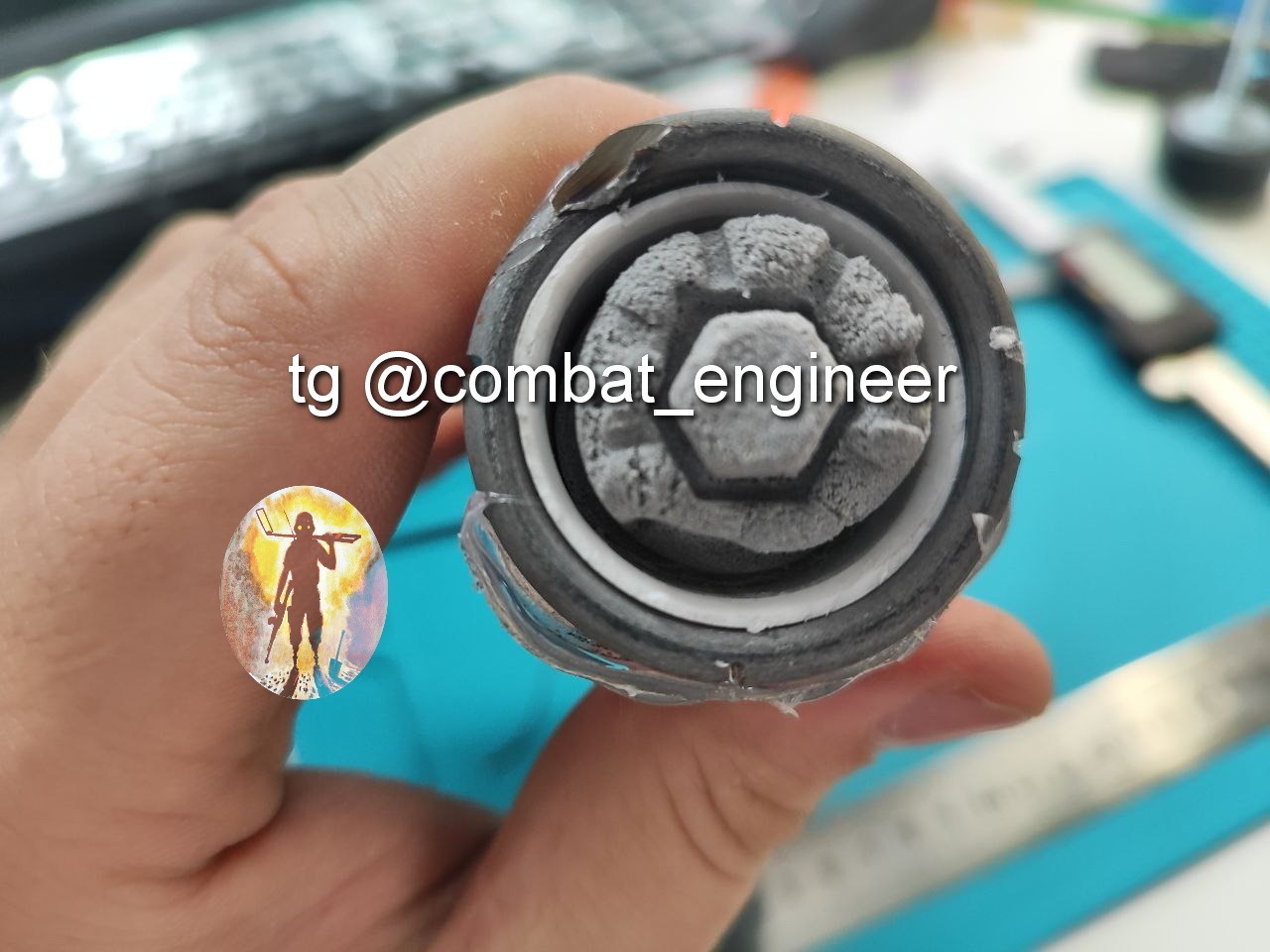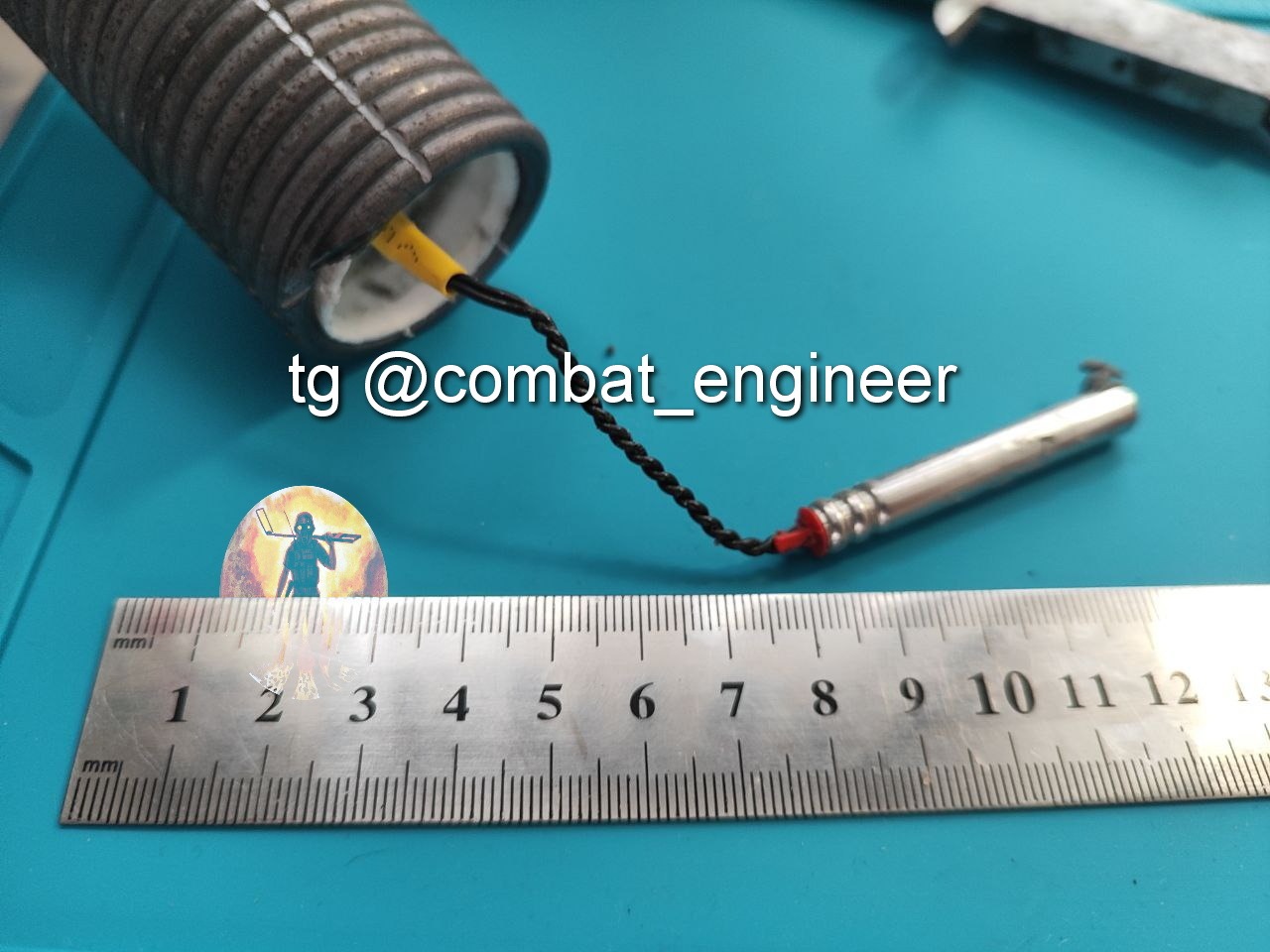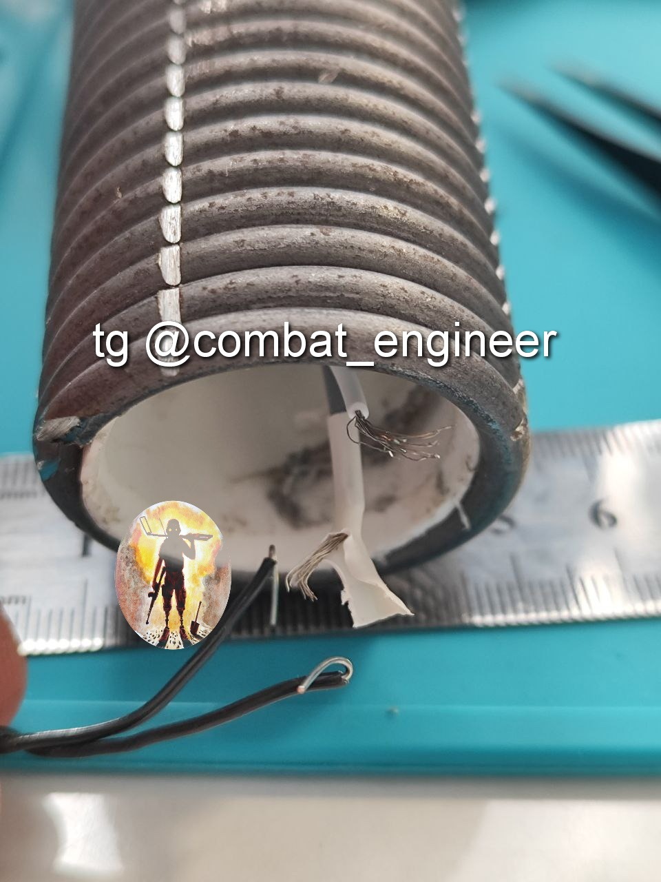 Основной заряд из ПВВ-7 помещен в пластиковую трубу, внутри заряда размещен ЭДП соединённый с электрической цепью разъемом (и что удивило соединение проводов на скрутке, но в термоусадочной трубке.
