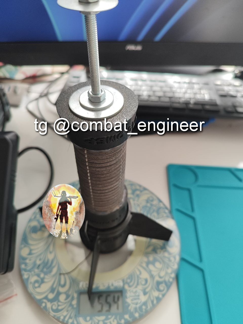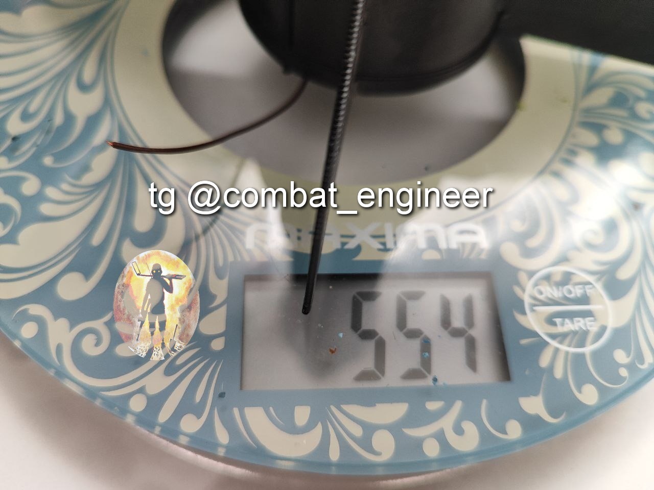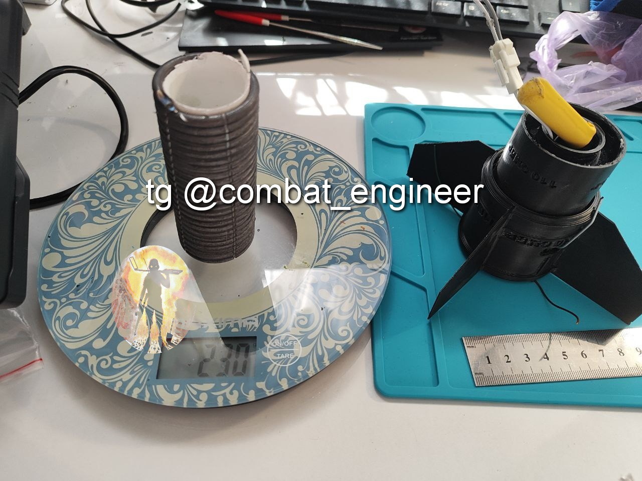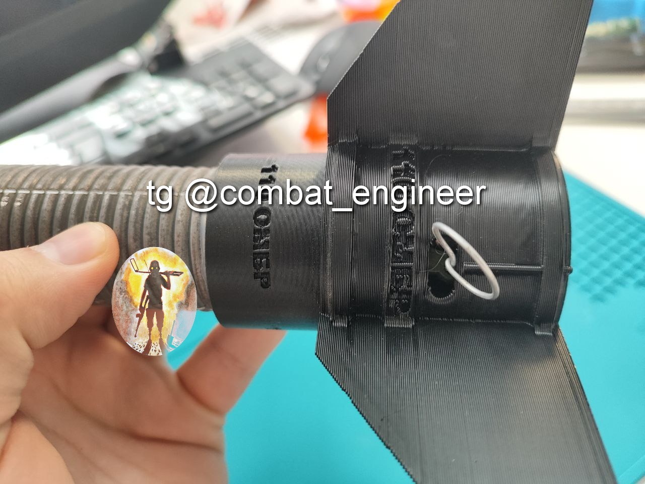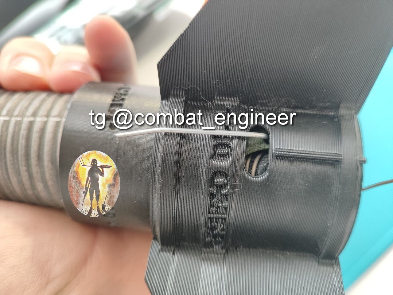 Материал корпуса пластик (с виду напечатано на 3д принтере petg), осколочная рубашка из 4 мм стальной проволоки навитой вокруг стержня диаметром 32 мм, с нанесенными насечками (4-мя прорезями глубиной около 2-2.5 мм для формирования поражающих элементов при взрыве основного заряда).