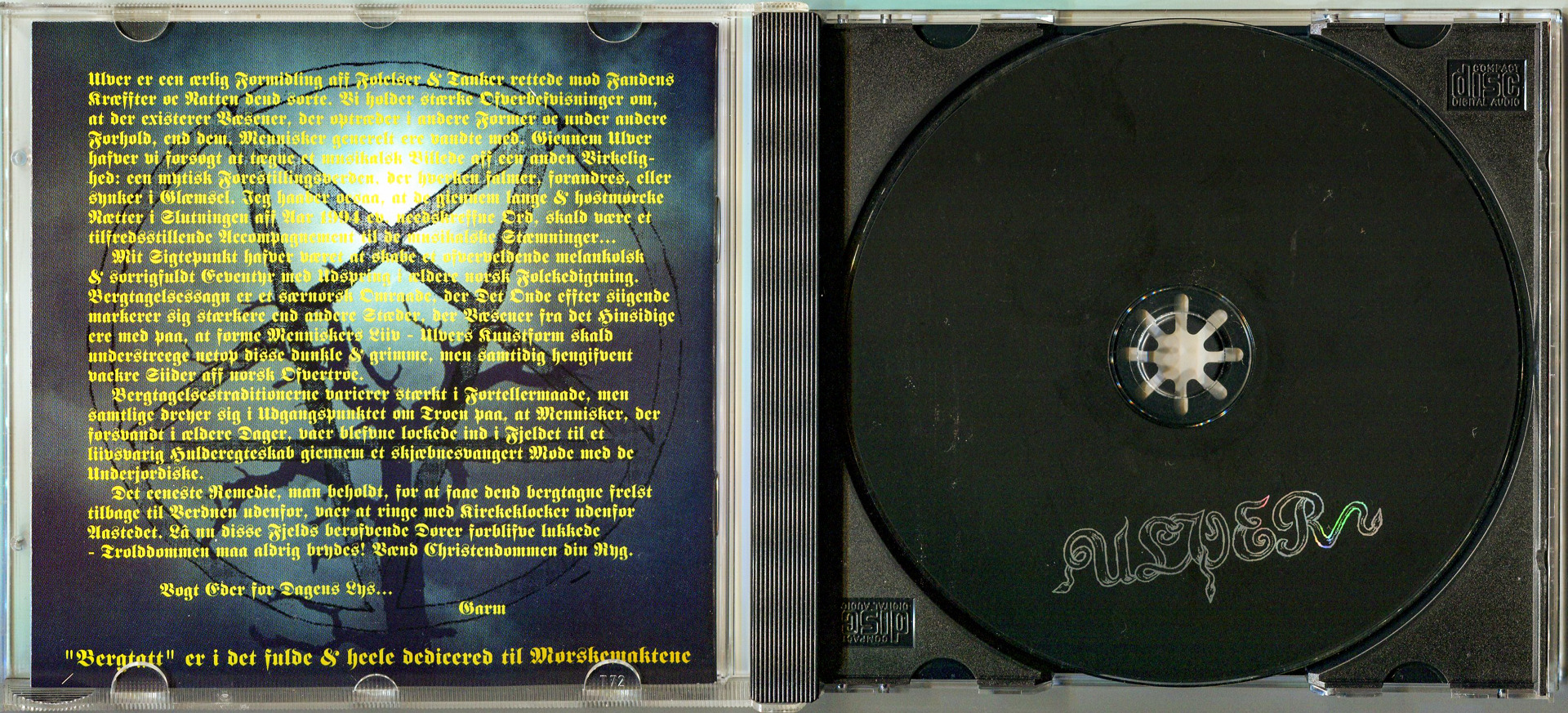 Ulver er een ærlig Formidling aff Følelser & Tanker rettede mod Fandens Kræffter oc Natten dend sorte. Vi holder stærke Ofverbefvisninger om, at der existerer Væsener, der optræder i andere Former oc under andere Forhold, end dem, Mennisker generelt ere vandte med. Giennem Ulver hafver vi forsøgt at tægne et musikalsk Billede aff een anden Virkelighed: een mytisk Forestillingsverden, der hverken falmer, forandres, eller synker i Glæmsel. Ieg haaber ocsaa, at de giennem lange & høstmørcke Nætter i Slutningen aff Aar 1994 ev, needskreffne Ord, skald være et tilfredsstillende Accompagnement til de musikalske Stæmninger...