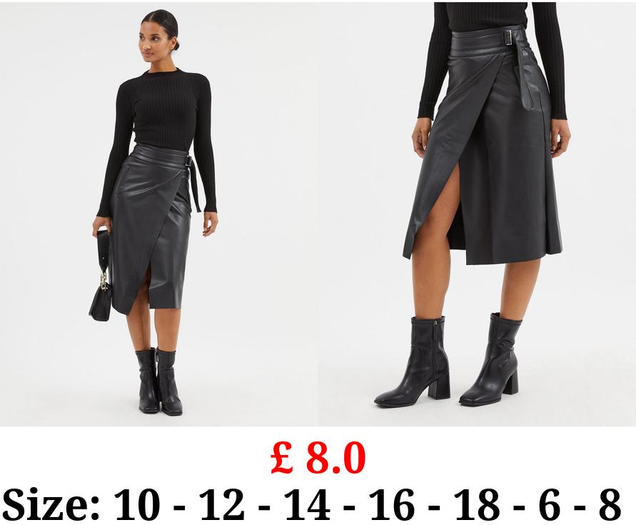 £ 8.0 Black Leather Look Wrap Midi Skirt