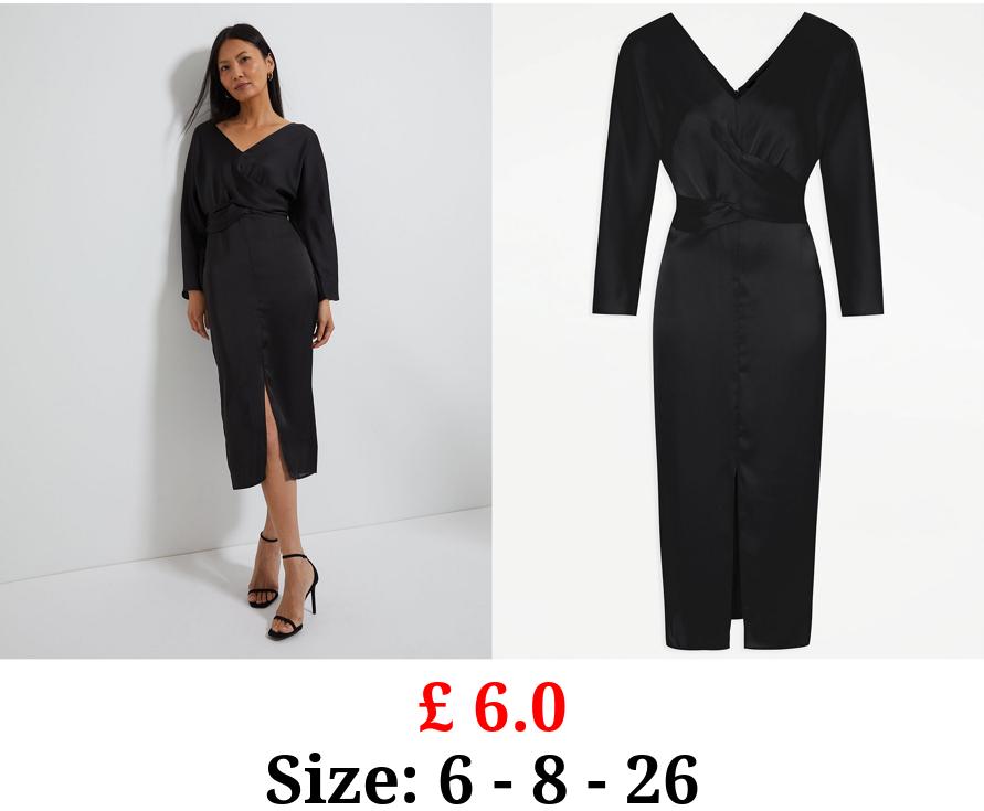 £ 6.0 Black Fitted V Neck Satin Wrap Midi Dress