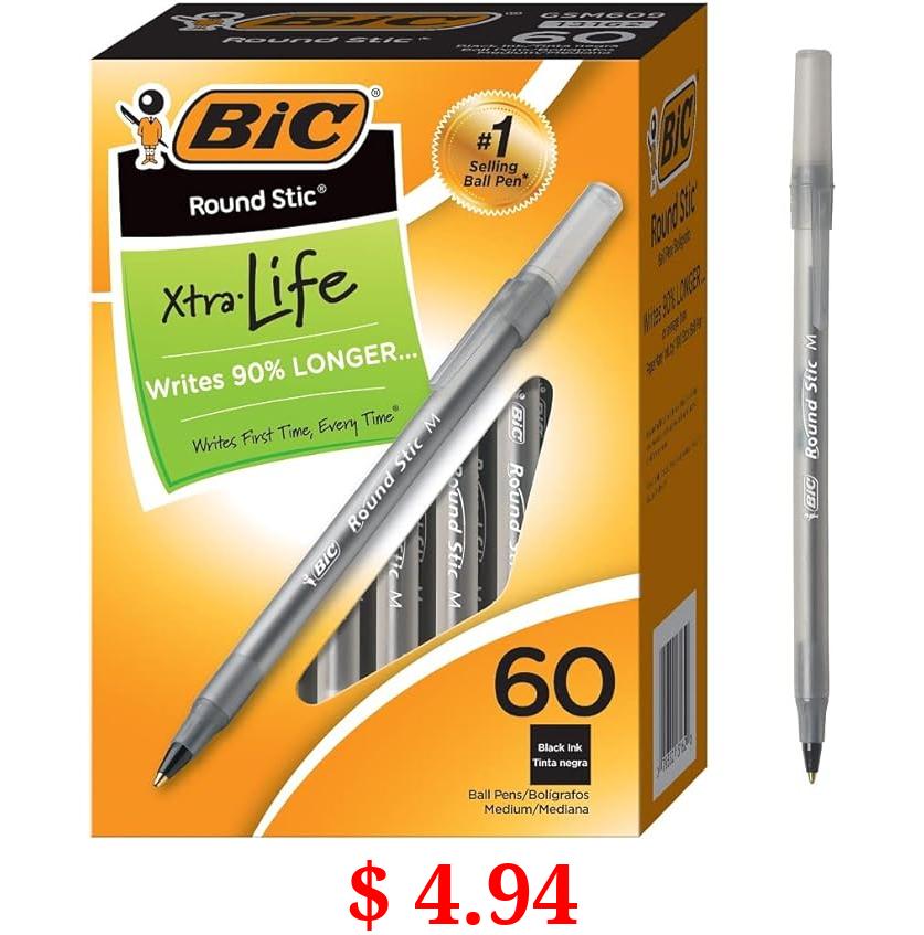 $ 4.94 BIC Round Stic Xtra Life Ballpoint Pens, Medium Point (1.0mm), Black, 60-Count Pack, Flexible Round Barrel For Writing Comfort (GSM609-BLK)