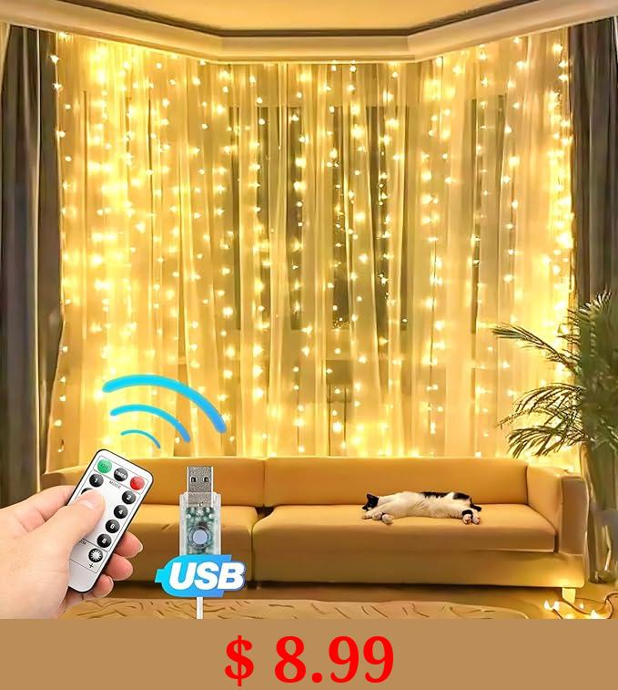 $ 8.99 Eueasy 300 LED Curtain Lights, 9.8ft x 9.8ft Fairy Lights with 8 Modes, String Hanging Lights, Remote Control, Perfect for Indoor/Outdoor Christmas, Wedding, Party Wall Decorations (Warm White)