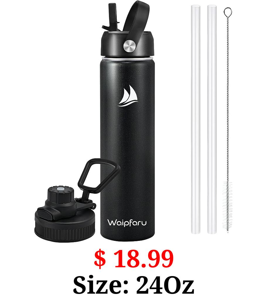 $ 18.99 Size: 24Oz Waipfaru Insulated Water Bottle 24oz, Stainless Steel Water Bottles with 2 Straws & 2 Lids, Metal Sports Water Bottle Keep Cold & Hot, Double Wall Vacuum Wide Mouth for Sports Gym Travel, Black