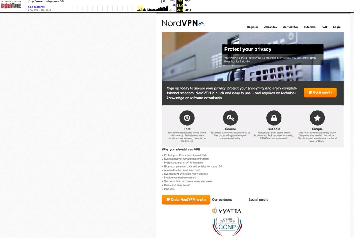 NordVPN — стремительно набирающий популярность сервис, зарегистрированный в Литве. Ведет деятельность с 2013 года. В графе «Наши партнеры» раньше было указано, что контора получила CCNP-сертификат от CISCO, но потом эта информация пропала с сайта.