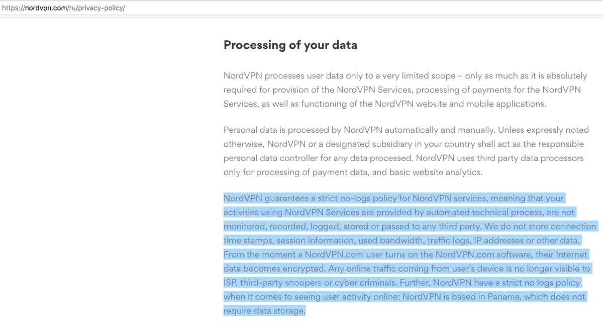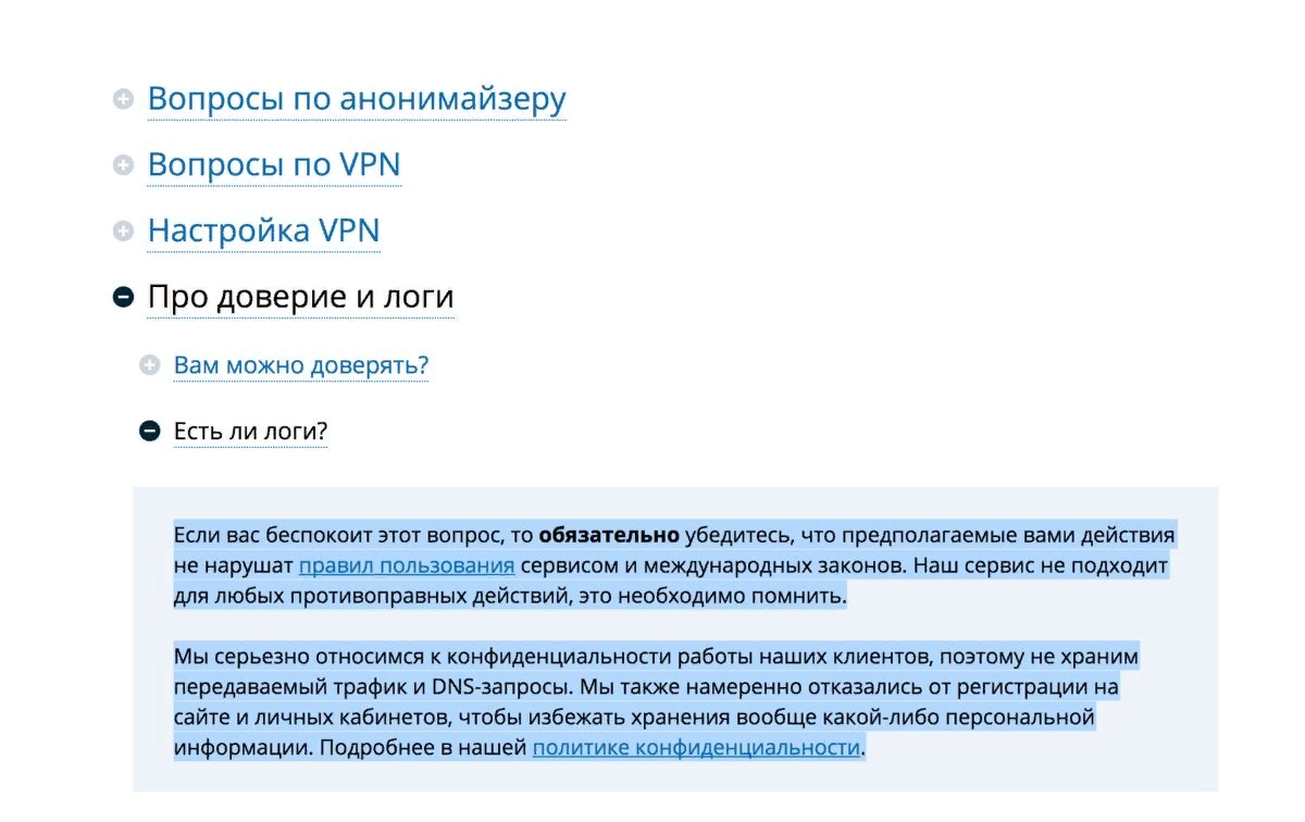Что касается Privacy Policy, тут все очень интересно. В статье из своей базы знаний руководство сервера отчетливо и без ужимок заявляет о том, что логи не ведутся. Однако просмотр «политики конфиденциальности» вызвал у меня определенные вопросы.