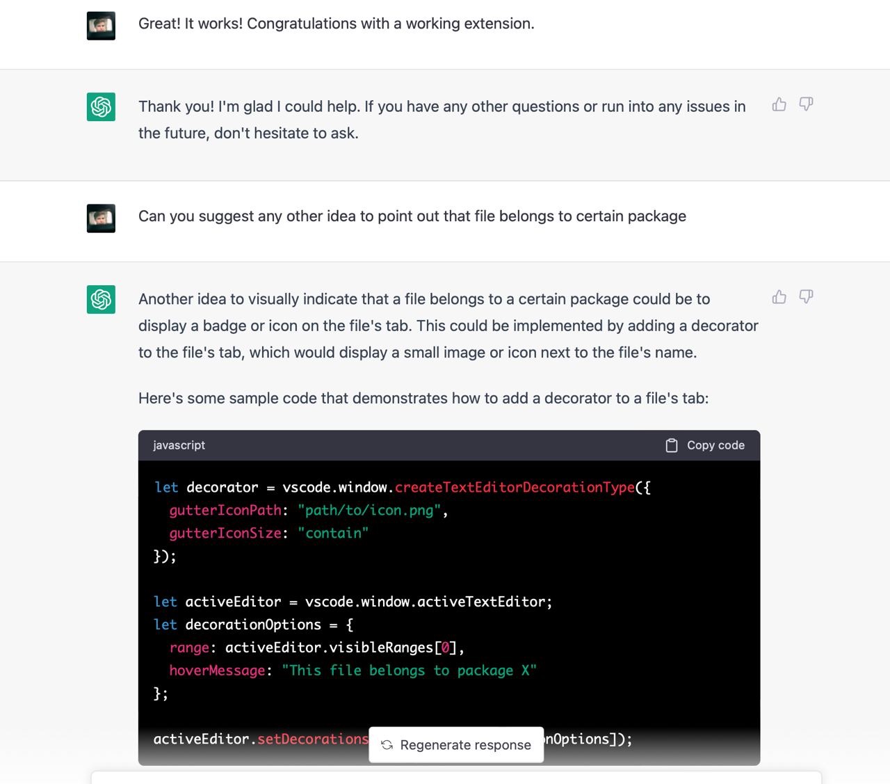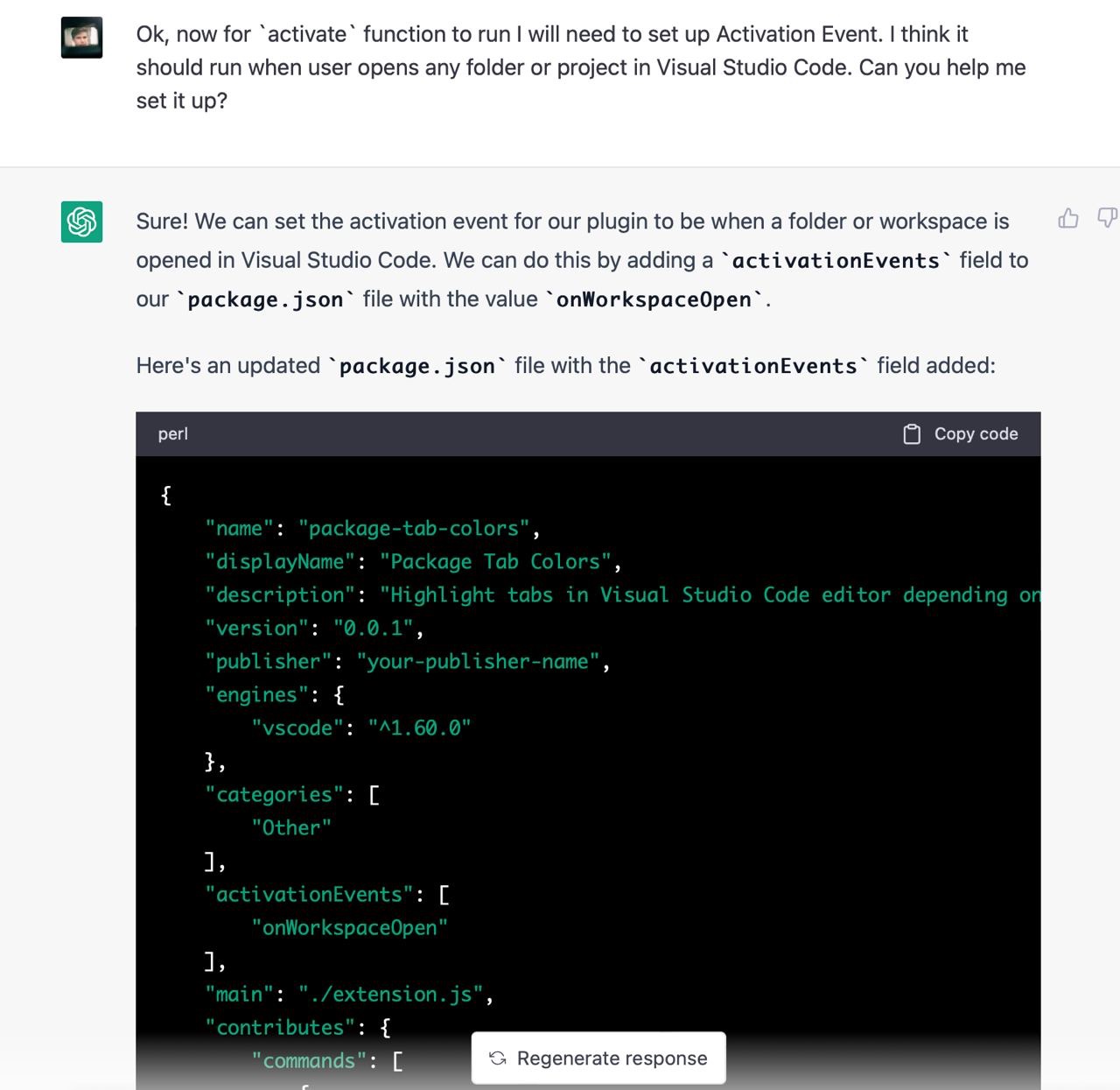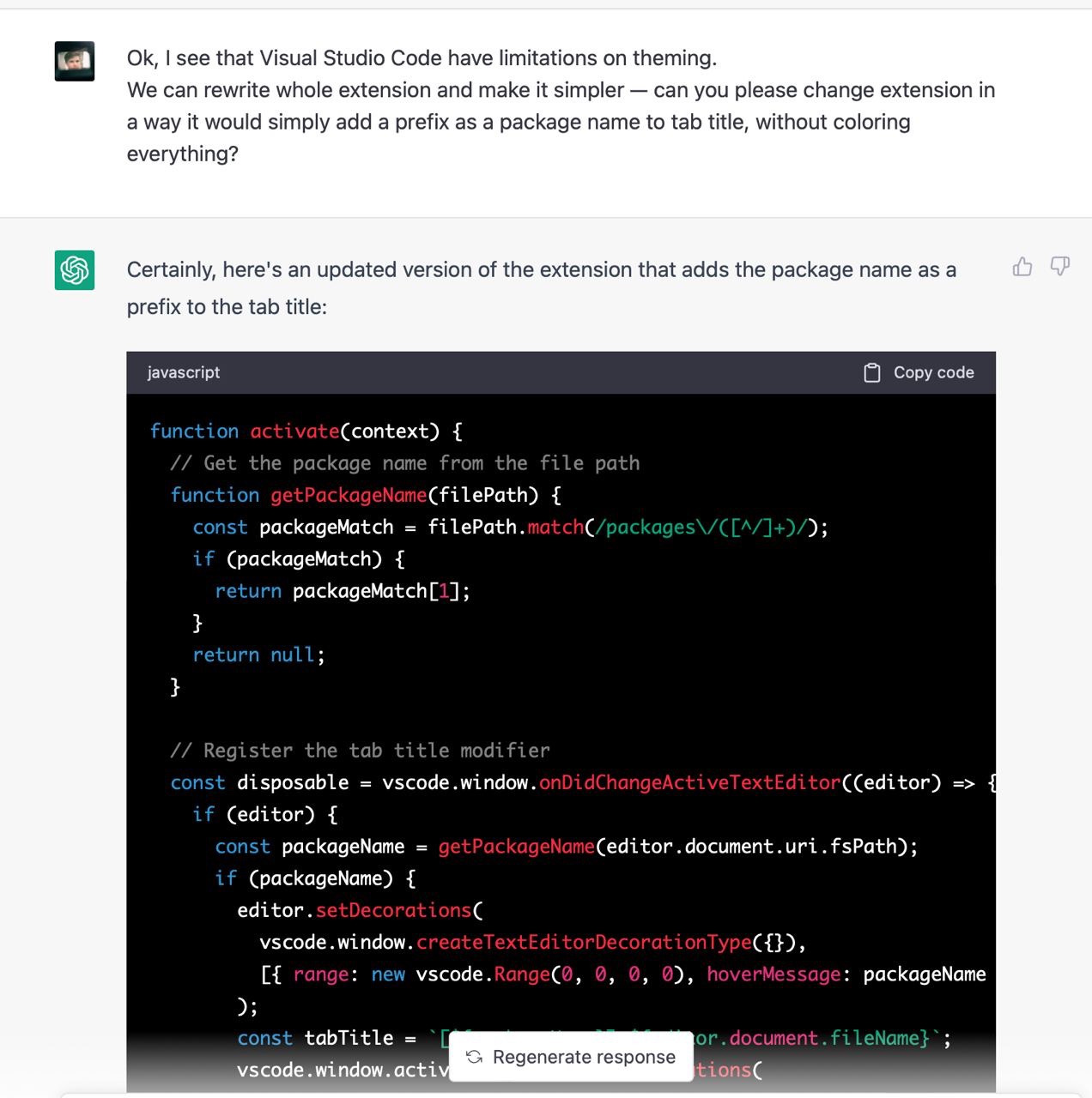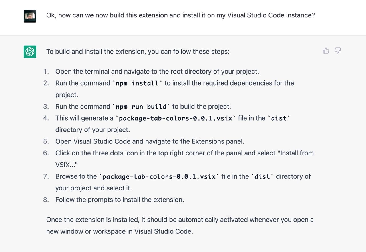 Я не зміг знайти пакета, який би вирішував мою проблему, тому вирішив написати його. Я ніколи не писав vscode додатки тому не знав які у них є обмеження, можливості і яке їх API. Чесно кажучи, я навіть не знав як їх дебажити. На те щоб розбиратись з усім цим у мене не було внутрішнього ресурсу, тому я попросив Chat GPT зробити роботу за мене. Загалом наше спілкування тривало кілька годин і завершилось під вечір. Тут я покажу найкращі фрагменти скріншотами з поясненнями.
