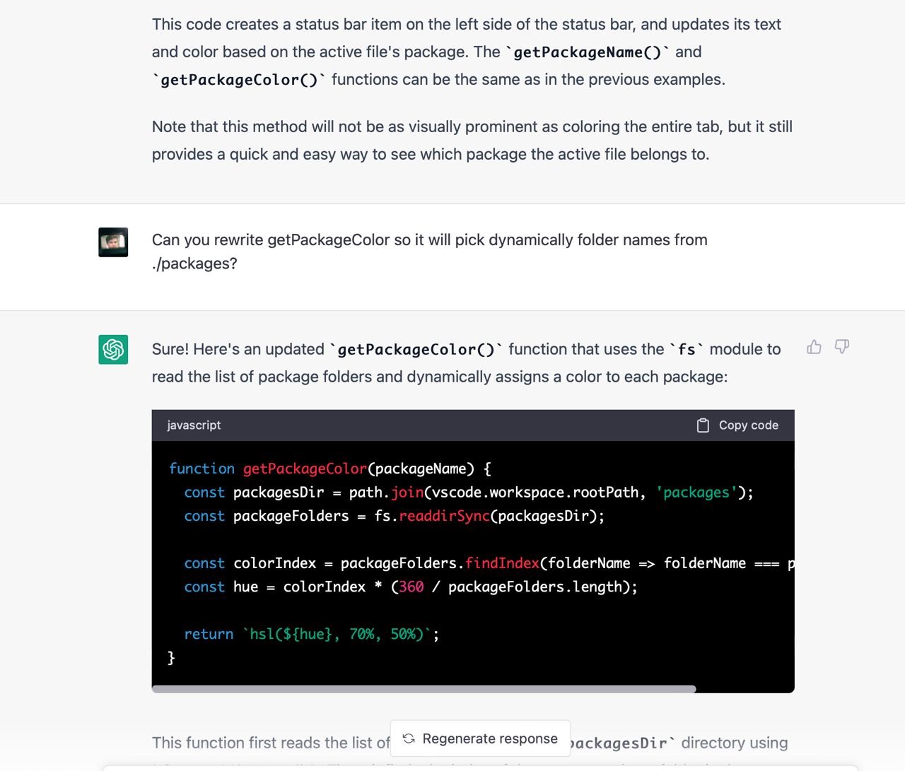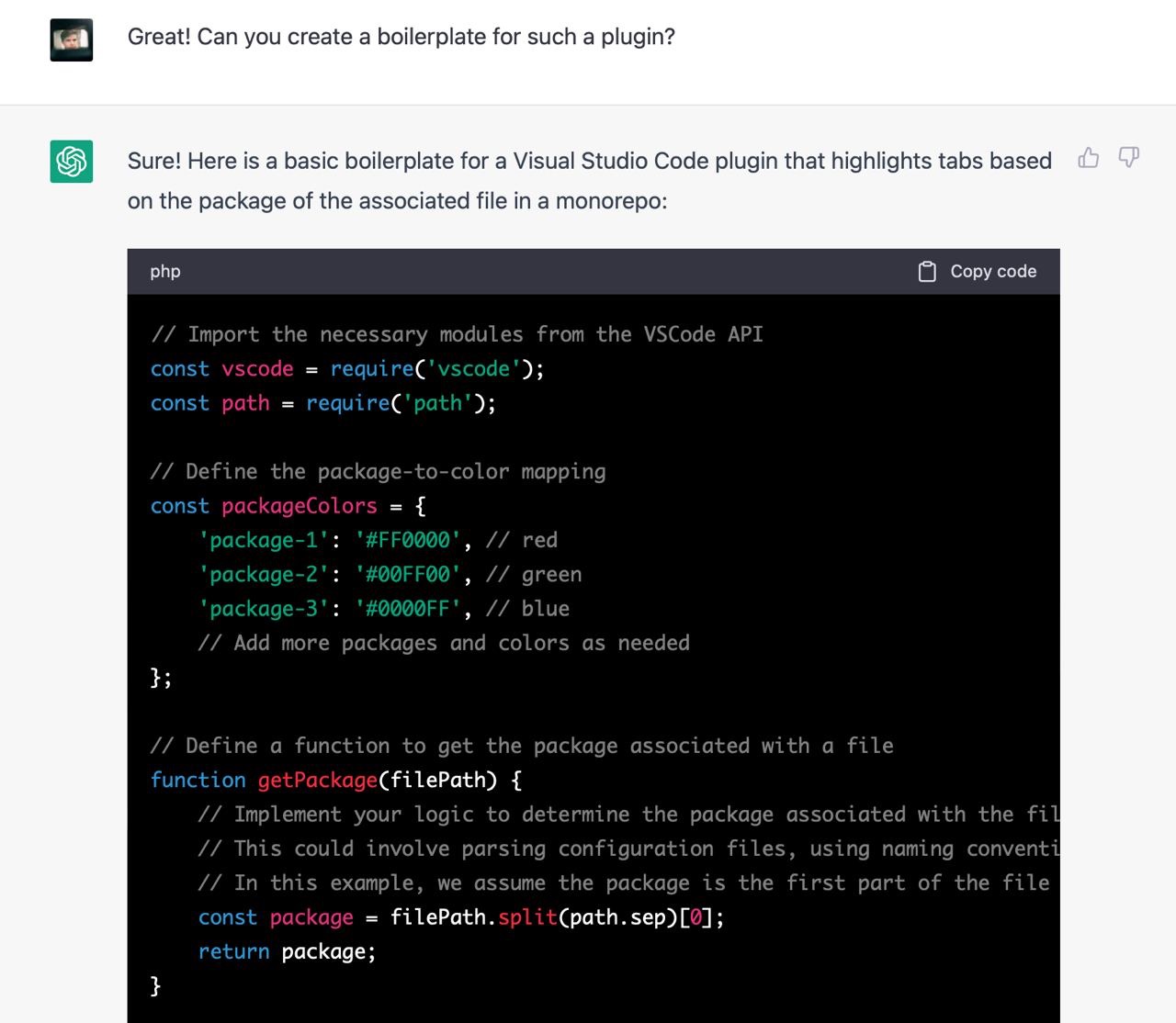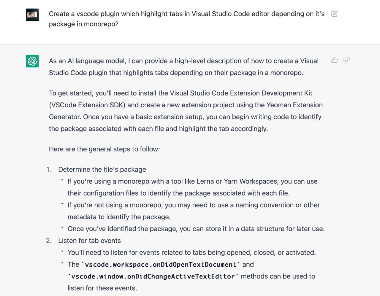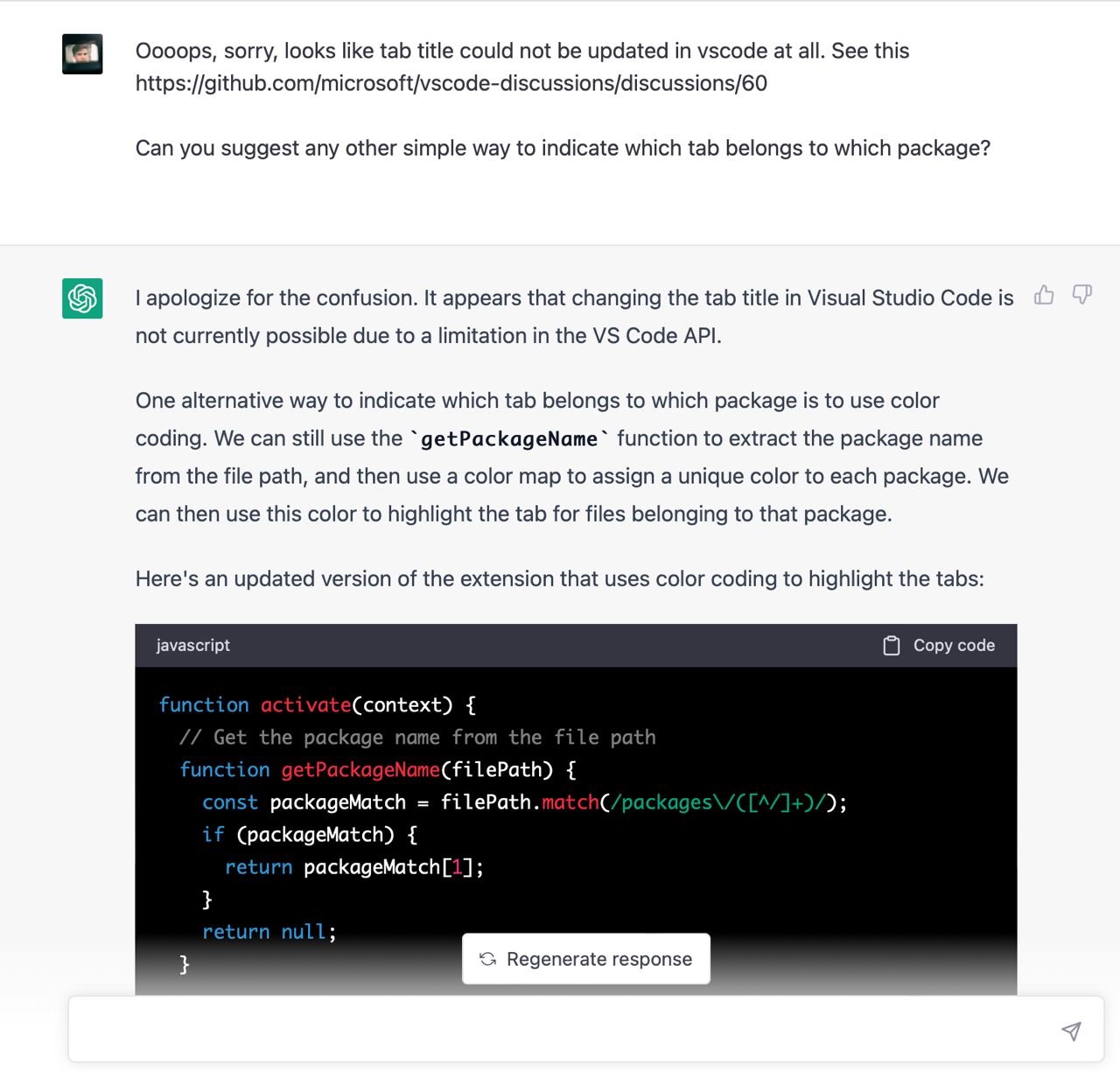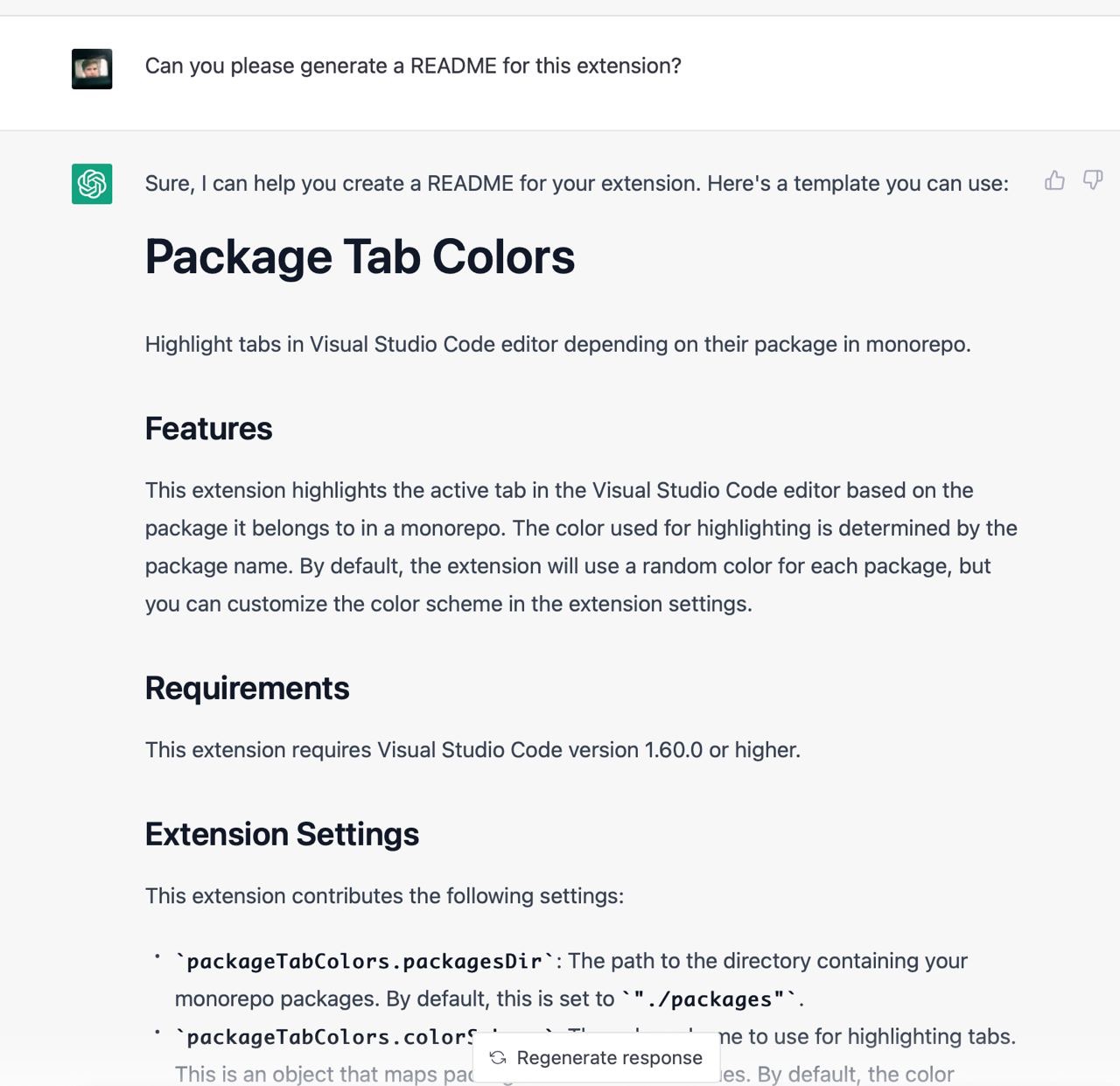 Я не зміг знайти пакета, який би вирішував мою проблему, тому вирішив написати його. Я ніколи не писав vscode додатки тому не знав які у них є обмеження, можливості і яке їх API. Чесно кажучи, я навіть не знав як їх дебажити. На те щоб розбиратись з усім цим у мене не було внутрішнього ресурсу, тому я попросив Chat GPT зробити роботу за мене. Загалом наше спілкування тривало кілька годин і завершилось під вечір. Тут я покажу найкращі фрагменти скріншотами з поясненнями.