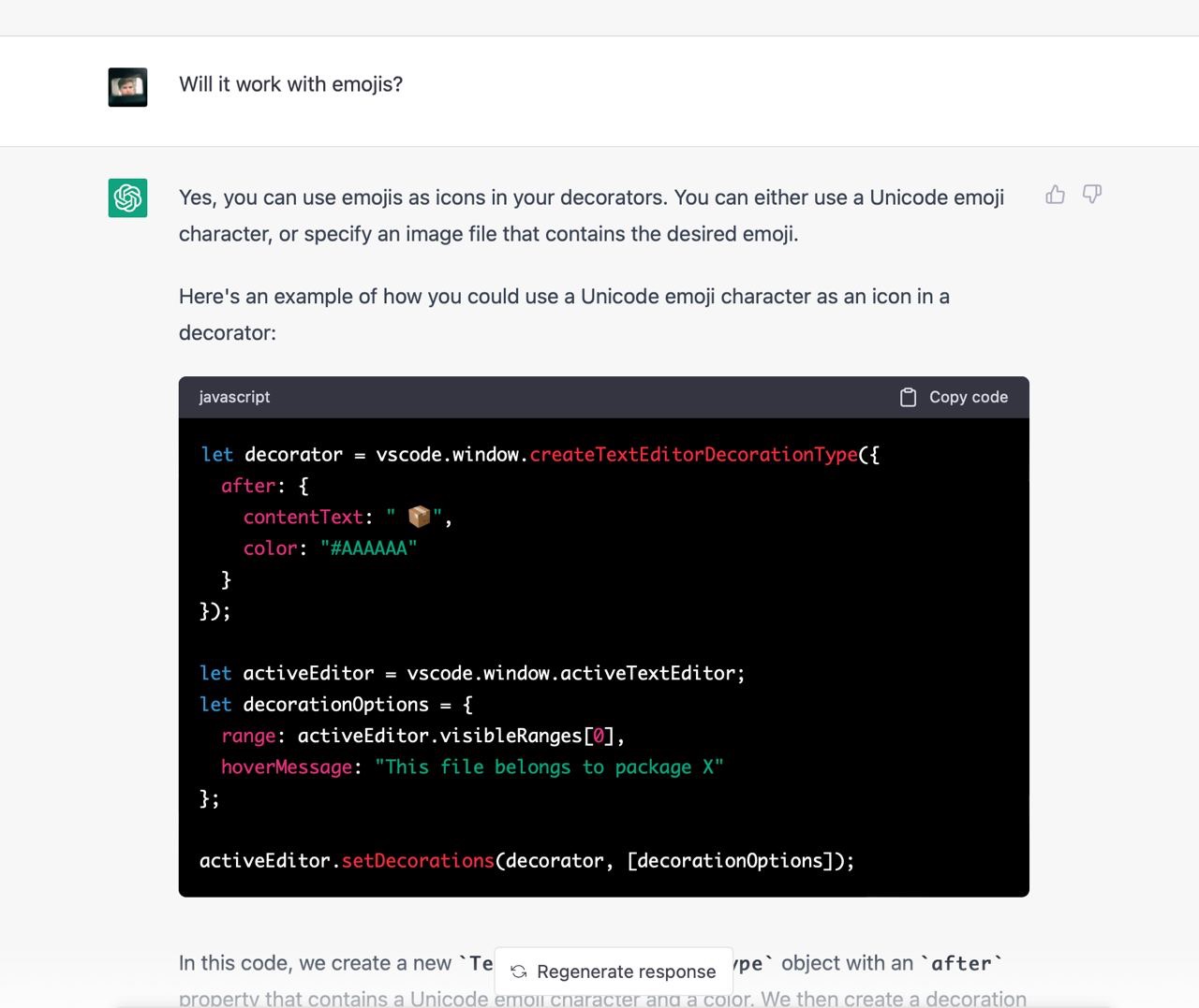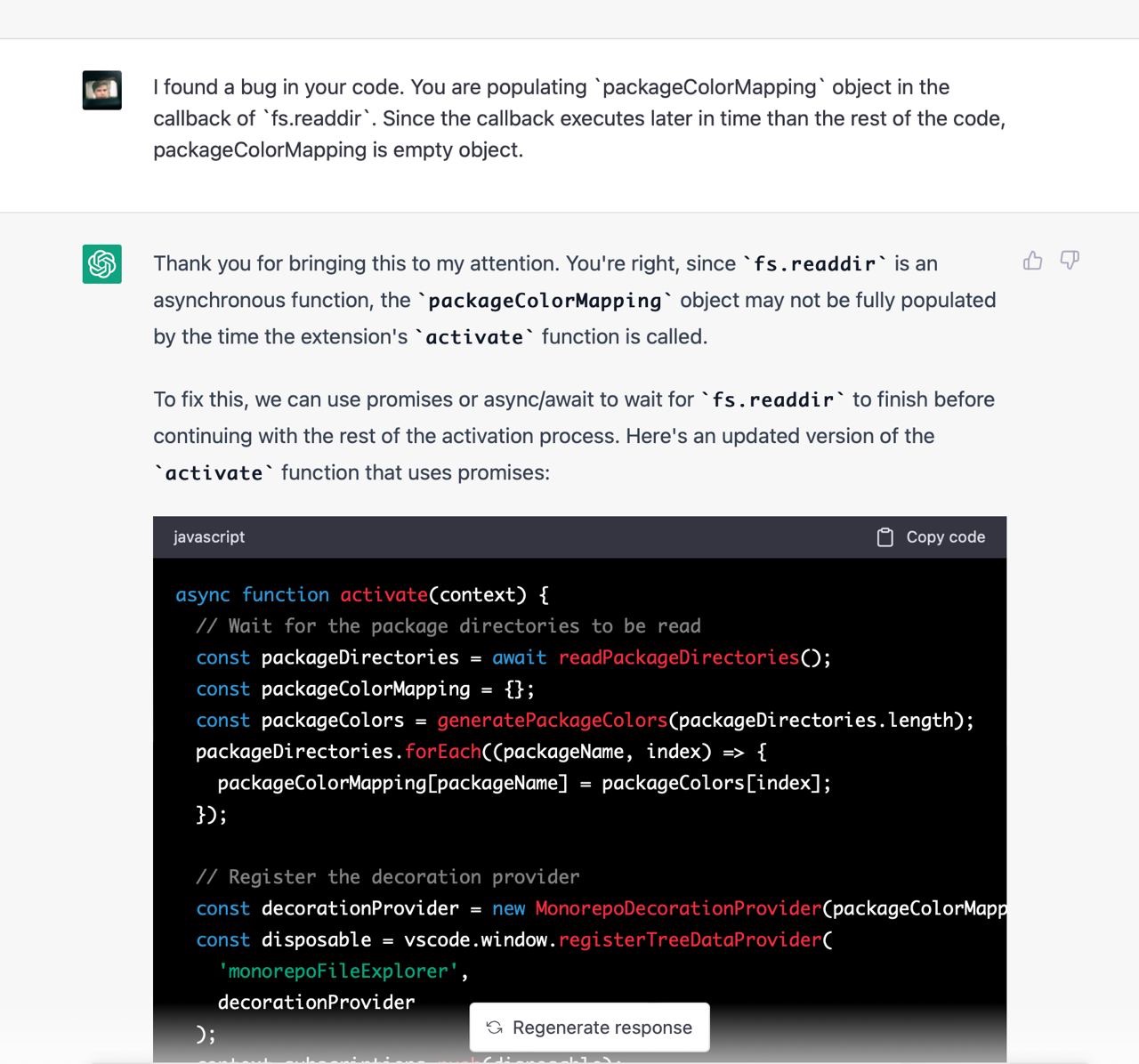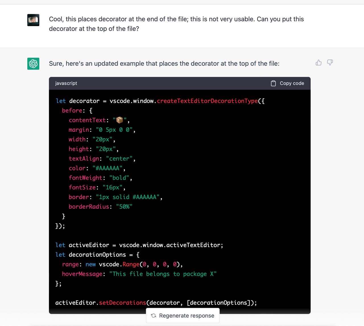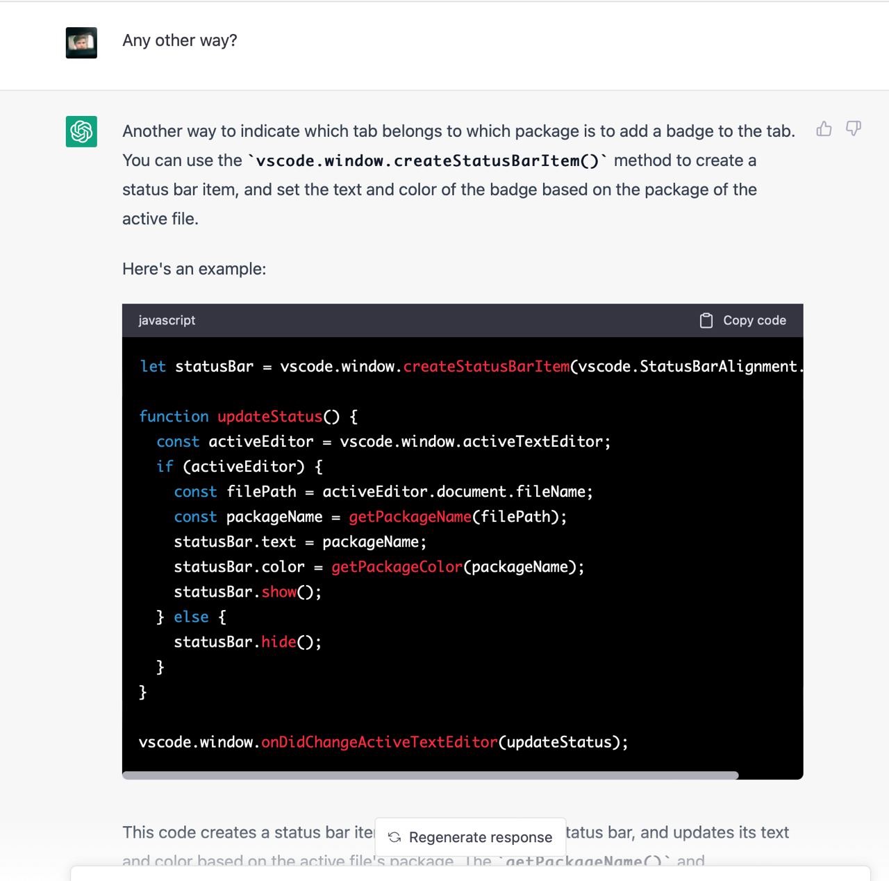 Я не зміг знайти пакета, який би вирішував мою проблему, тому вирішив написати його. Я ніколи не писав vscode додатки тому не знав які у них є обмеження, можливості і яке їх API. Чесно кажучи, я навіть не знав як їх дебажити. На те щоб розбиратись з усім цим у мене не було внутрішнього ресурсу, тому я попросив Chat GPT зробити роботу за мене. Загалом наше спілкування тривало кілька годин і завершилось під вечір. Тут я покажу найкращі фрагменти скріншотами з поясненнями.
